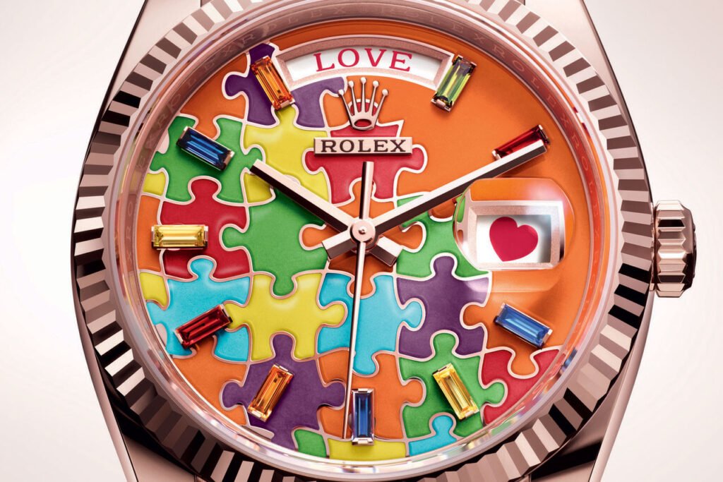 Rolex geeft de Day-Date een onverwachte creatieve twist met een nieuwe uitvoering die emotie oproept. De wijzerplaat is een legpuzzel waarvan de stukken in turkooisblauw, rood, fuchsia, oranje, groen en geel in elkaar passen en elk de belangrijkste momenten in het leven vertegenwoordigen. De weekdag heeft plaatsgemaakt voor de woorden Happy, Eternity, Gratitude, Peace, Faith, Love en Hope. Het venster op 3 uur toont 31 exclusieve emoji’s in plaats van de datum. Dit alles maakt deze Day-Date duidelijk anders dan wat we van Rolex gewend zijn, maar toch is het bekende model nog altijd in een oogopslag herkenbaar.