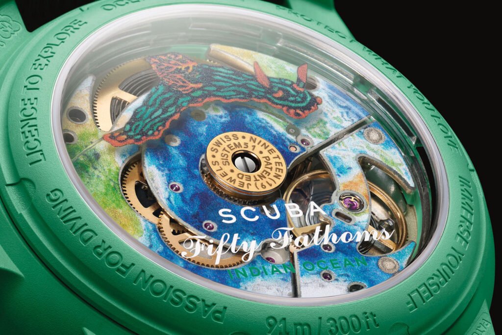 Okay, de grootste verrassing is er al vanaf nadat fans in ellenlange rijen stonden om een Omega Speedmaster van Swatch in handen te krijgen. Blancpain doet het succes van de Moonswatch nu nog eens dunnetjes over door een andere klassieker in handen van Swatch te geven. De zeventig jaar oude Fifty Fathoms is er nu als de Bioceramic Scuba Fifty Fathoms. De vijf mechanische horloges in de Bioceramic Scuba Fifty Fathoms Collection reproduceren trouw alle kenmerken van dit Zwitserse horlogemakericoon en verwijzen tegelijkertijd naar de Scuba, de eigen duikhorlogelijn van Swatch. Elk model viert een van de vijf Oceanen en de prachtige, kleurrijke dieren die bekend staan als naaktslakken en die in hun diepten leven.