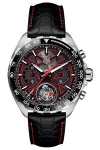 TAG Heuer eert misschien wel de bekendste coureur allertijden in een titanium chronograaf met tourbillon. Het is hier niet Max Verstappen, maar Mario die in een kart zijn rondes om de tourbillon maakt. Op de voet gevolgd door de Spiny Shell en Bullet Bill legt hij elke ronde in exact een minuut af. Dit eerbetoon van TAG Heuer aan de beroemde wereld van de kleine Italiaanse loodgieter verwijst op verschillende manieren naar de videogame van Nintendo, zoals de keramische bezel met Mario-logo, de opnieuw ontworpen tourbillonkooi en de rode stiksels op de zwarte kalfleren band.