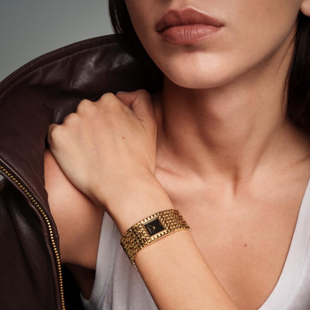 De Classics Manchette is een uitgesproken ontwerp dat zijn inspiratie haalt uit de glamrock-esthetiek en de vrijgevochten horlogestijl van de jaren waarin durf centraal stond. Het horloge presenteert zich letterlijk als een manchet: krachtig, hoekig en rijk gedetailleerd. Het Clou de Paris-motief op de band en de vierkante vorm die terugkomt op de wijzerplaat versterken het grafische karakter van het ontwerp.