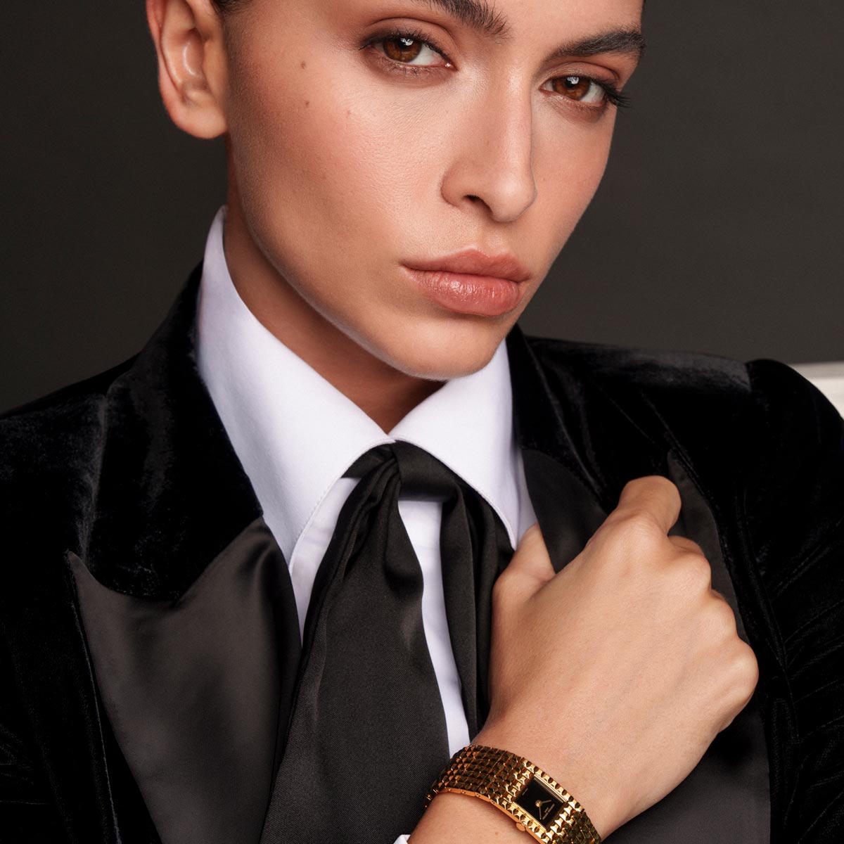 In deze nieuwe uitvoering zorgt de zwarte onyx wijzerplaat voor een sterk contrast met de gouden kast. Het natuurlijke mineraal geeft het horloge een ruwe, bijna sculpturale uitstraling, terwijl het spel van licht en schaduw de leesbaarheid van de wijzers benadrukt. Chic en rebels gaan hier hand in hand – precies zoals de Classics Manchette bedoeld is.