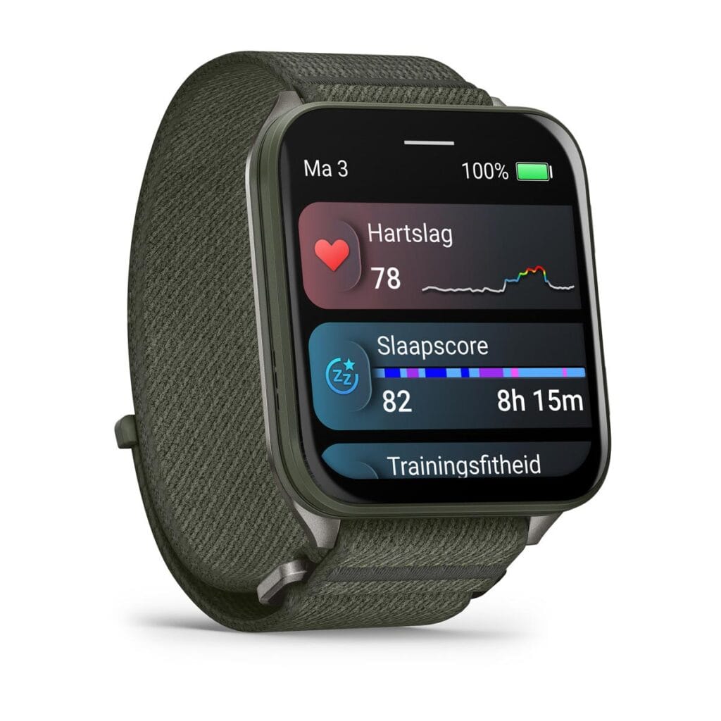 De Venu X1 beschikt over een royaal 2-inch AMOLED-scherm dat zelfs in fel zonlicht perfect afleesbaar blijft. Het display is geplaatst achter krasbestendig saffierglas en wordt omlijst door een elegante titanium kast. Voor een premium draagervaring is de smartwatch uitgerust met een comfortabele ComfortFit nylon band met snelsluiting. Verkrijgbaar in stijlvol zwart of eigentijds mosgroen.