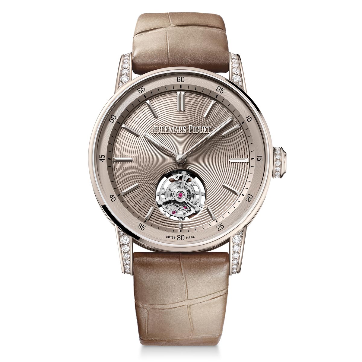Audemars Piguet presenteert een nieuwe toevoeging aan zijn collectie van gecompliceerde modellen: de Code 11.59 by Audemars Piguet Selfwinding Flying Tourbillon met een kast van 38 millimeter. Het model onderscheidt zich door een monochrome uitstraling, waarin de warme gloed van sand gold wordt gecombineerd met de schittering van briljantgeslepen diamanten. Voor het eerst brengt de manufactuur een zelfopwindende flying tourbillon in dit formaat uit, aangedreven door het ultradunne RD#3-uurwerk, kaliber 2968.