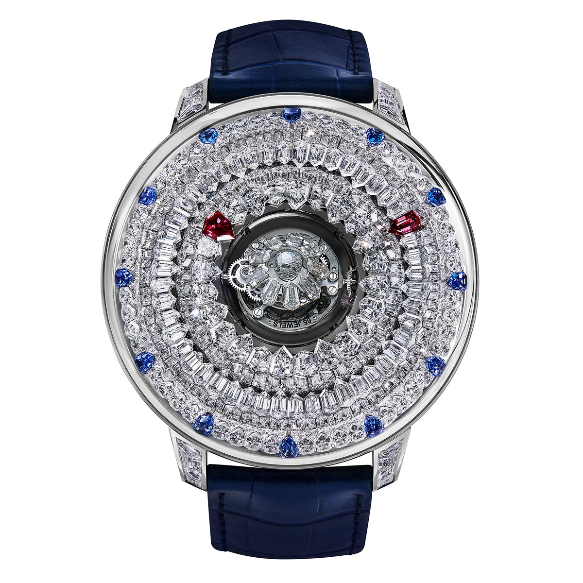 De Mystery Tourbillon 44mm is een hoogtepunt van Jacob & Co.’s kunst van edelsteenzetting, gecombineerd met een uitzonderlijke horlogetechnische complicatie, speciaal gecreëerd voor vrouwen. In een veld van diamanten verschijnt elke twee minuten een bloem uit het hart van het uurwerk, die zich in perfecte concentrische harmonie uitlijnt met de omgeving. Die bloem is een driedubbele, vliegende, centrale tourbillon. Het afleesprincipe van de Mystery Tourbillon 44mm is een knipoog naar de mysterieuze klokken: uren en minuten verschijnen op ringen, waarbij elke tijdsmarkering is uitgevoerd in baguette-geslepen robijnen. Een derde ring draagt twaalf uurmarkeringen van blauwe saffieren.