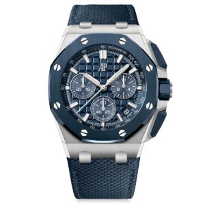 Dit sportieve horloge uit de Royal Oak Offshore collectie van Audemars Piguet combineert roestvrij staal met ‘Bleu Nuit, Nuage 50’ keramiek. Deze opvallende tweekleurige referentie biedt een krachtig kleurcontrast dat doorloopt tot de wijzerplaat en het robuuste ontwerp van de collectie versterkt. De 43mm kast combineert een roestvrijstalen kastmiddenstuk, bodem, kroonchip en drukknoppen met een lunette, drukknoppen en kroon van ‘Bleu Nuit, Nuage 50’ keramiek. Het horloge is waterbestendig tot 100 meter.