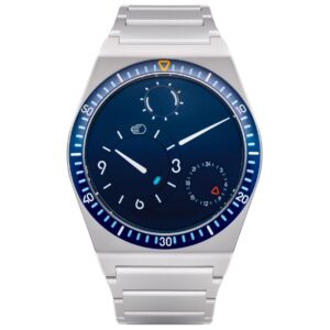 De Ressence TYPE 7 is het meest geavanceerde horloge van het merk: een 41mm Grade 5 titanium kast met een oliegevulde wijzerplaat die uitzonderlijke afleesbaarheid biedt, alsof de tijd op het saffierglas zweeft. Verkrijgbaar in Night Blue en Light Blue, belichaamt hij functionaliteit en eenvoud. De nieuwe GMT-functie maakt het horloge ideaal voor wereldreizigers. Licht, intuïtief en doelgericht: een instrument dat met de drager meebeweegt.