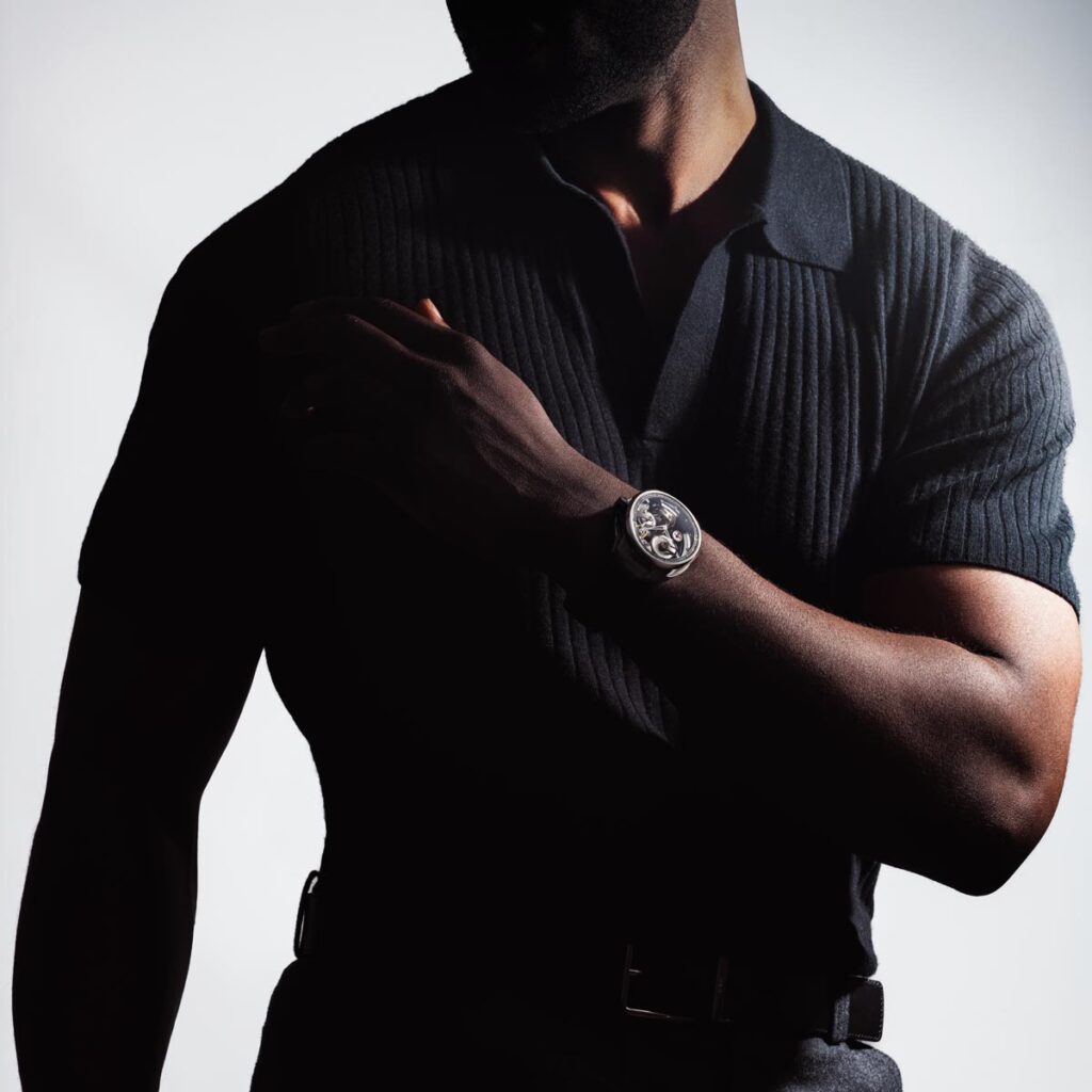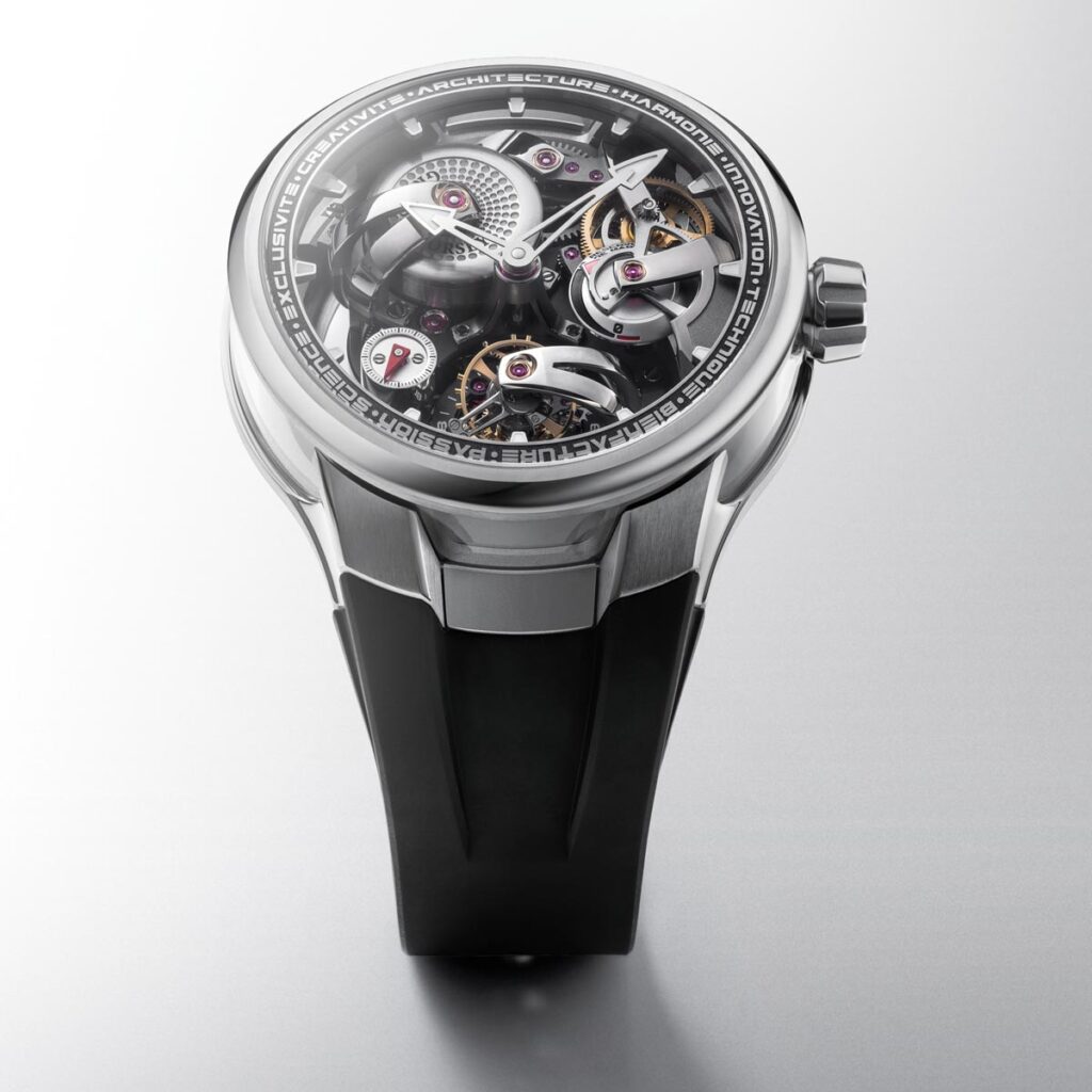 Vanaf het eerste moment brak dit model radicaal met traditie. Geen klassiek uurwerk verborgen in een kast, maar een fascinerend mechanisch landschap waarin elk onderdeel zichtbaar en betekenisvol is. Alles draait hier om beleving, licht dat speelt met diepte, vormen die lijken te zweven en techniek die zich zonder enige terughoudendheid toont. Het resultaat is een horloge dat niet alleen de tijd weergeeft, maar vooral verwondering oproept.