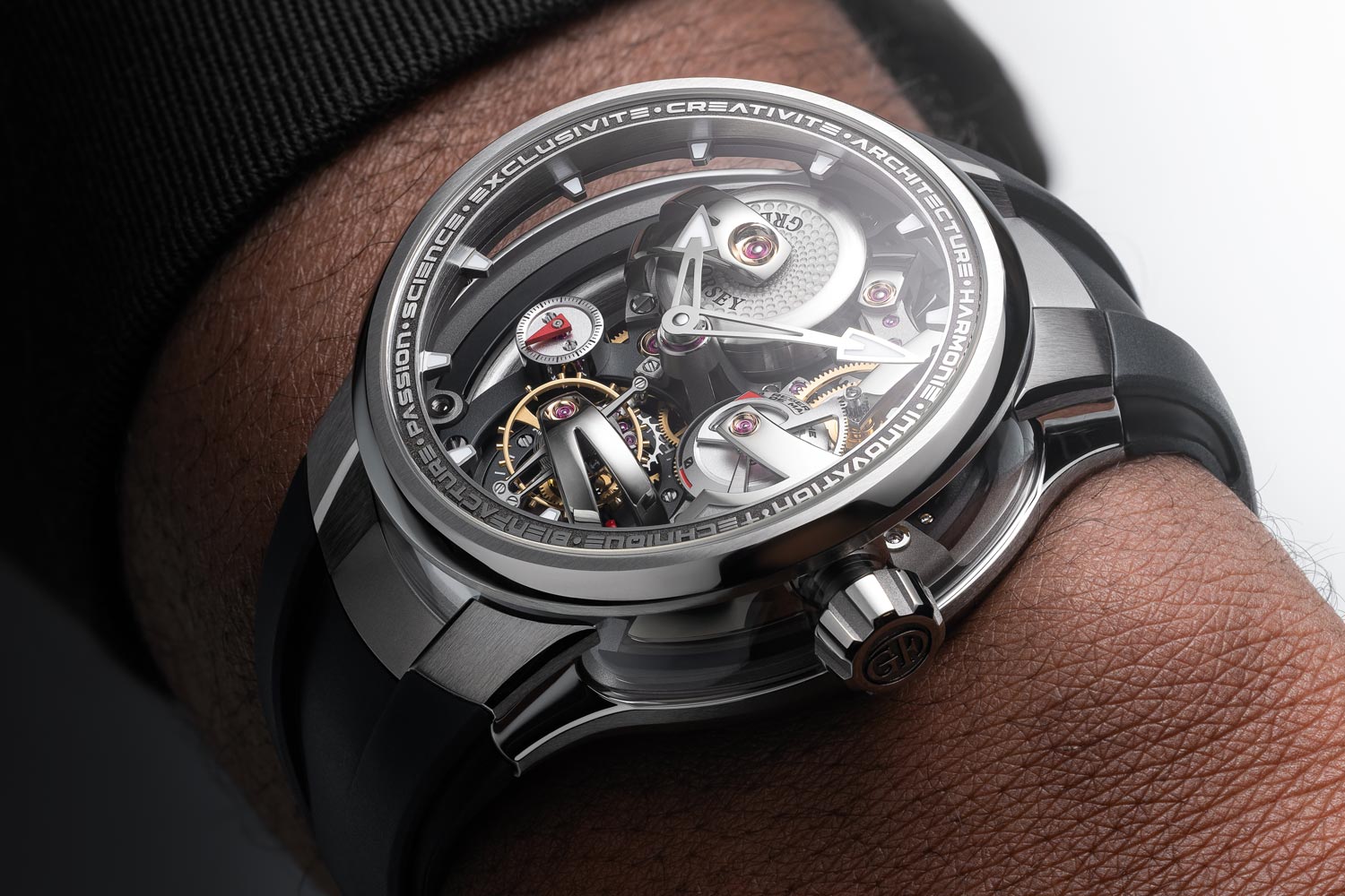 Maximale transparantie en verfijnde contrasten onderstrepen de pure horlogearchitectuur