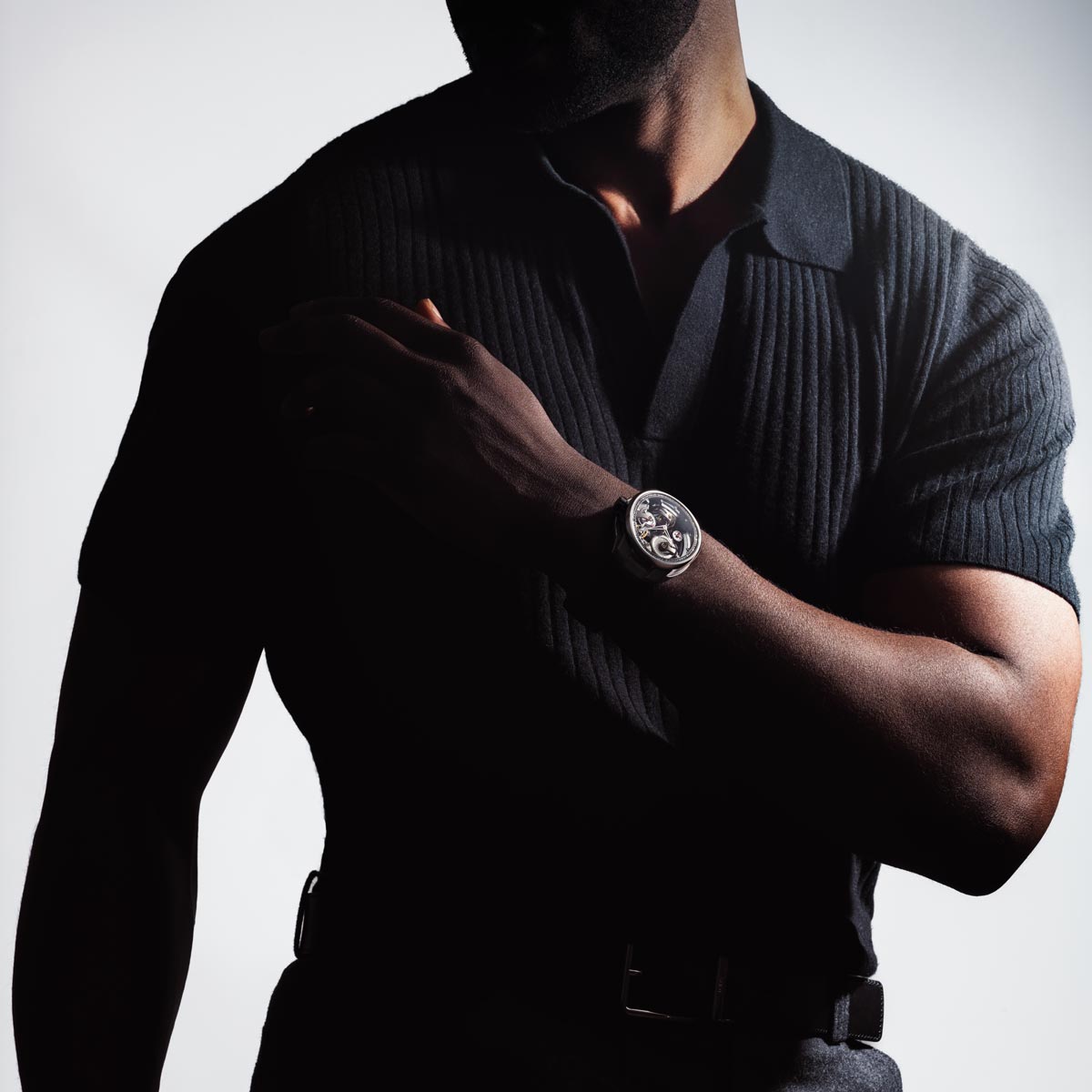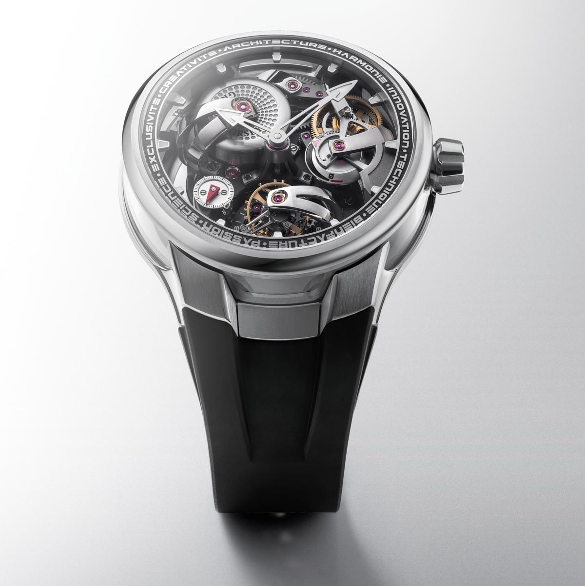 Maximale transparantie en verfijnde contrasten onderstrepen de pure horlogearchitectuur