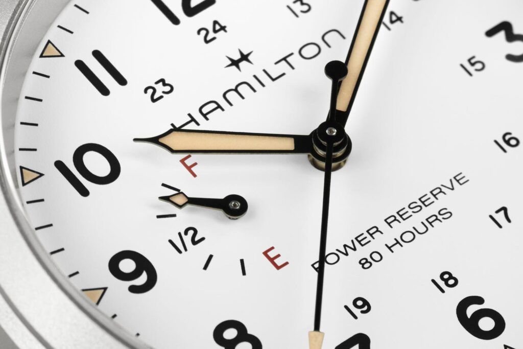 Voor de Khaki Field Power Reserve Mechanical is inspiratie geput uit de klassieke mechanische soldatenhorloges en het kenmerkende kleurenpalet. Hierin blijft de vormgeving en de stoere esthetiek van de collectie perfect behouden. De wijzers zijn gecoat met Super-LumiNova Old Radium voor een authentieke vintage uitstraling. De gangreserve-indicator op 9 uur is uitgevoerd in een opvallende rode kleur en geeft de letters ‘F’ voor vol en ‘E’ voor leeg duidelijk weer. Om dit bijzondere en nuttige kenmerk te benadrukken, is de vermelding ‘gangreserve 80 uur’ prominent zichtbaar op de wijzerplaat.