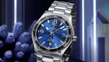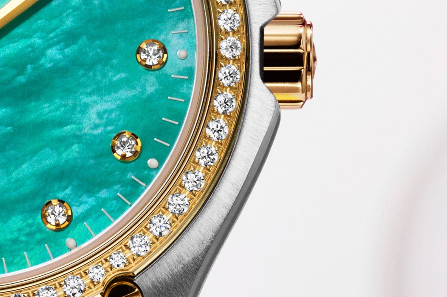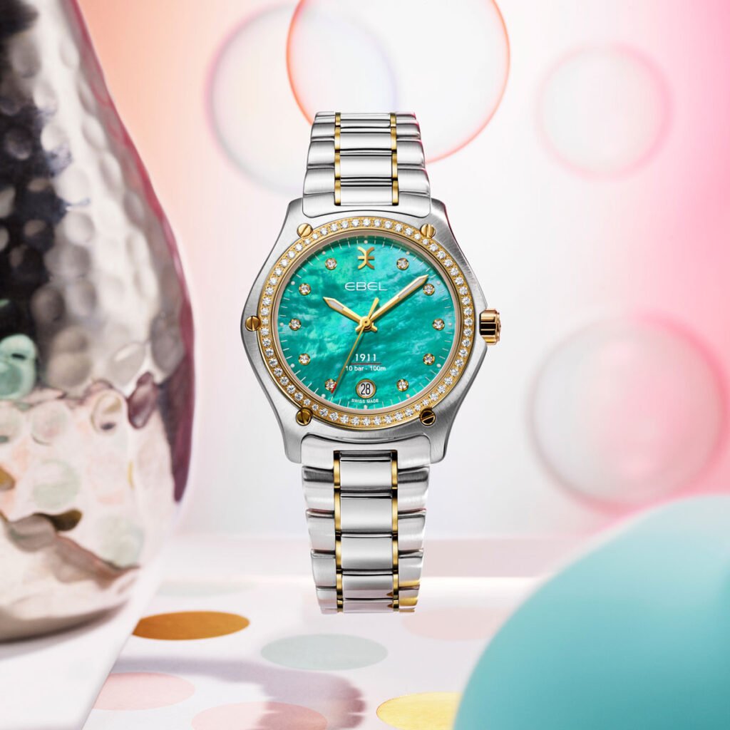 Een mooi voorbeeld uit 2024 is de Ebel 1911 Deep Turquoise. Het dameshorloge heeft een diameter van 34 millimeter en valt vooral op door een diep turquoise parelmoeren wijzerplaat met tien indexen van diamant. De bezel wordt opgesierd door nog eens zestig diamanten. Het toont de tijd en de datum dankzij een quartz uurwerk. Het model wordt geleverd met een band van edelstaal en geelgoud, maar kan ook worden gedragen met een bruine kalfleren band.