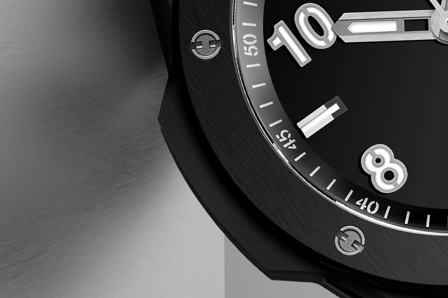 We hebben het hier over de Big Bang van Hublot, die vele kenmerkende eigenschappen in één horloge combineert. Naast een oversized afmeting zijn dat de krachtige kast met zijn twee ‘oren’ aan weerszijden, de bezel versierd met zes H-vormige functionele schroeven, de grote skeletuur- en minutenwijzer vergezeld van hun secondewijzer afgewerkt met de het kenmerkende contragewicht van de fabrikant, alle even genummerde indexen van 2 tot 12 op de wijzerplaat en het rubber op de kroon.
