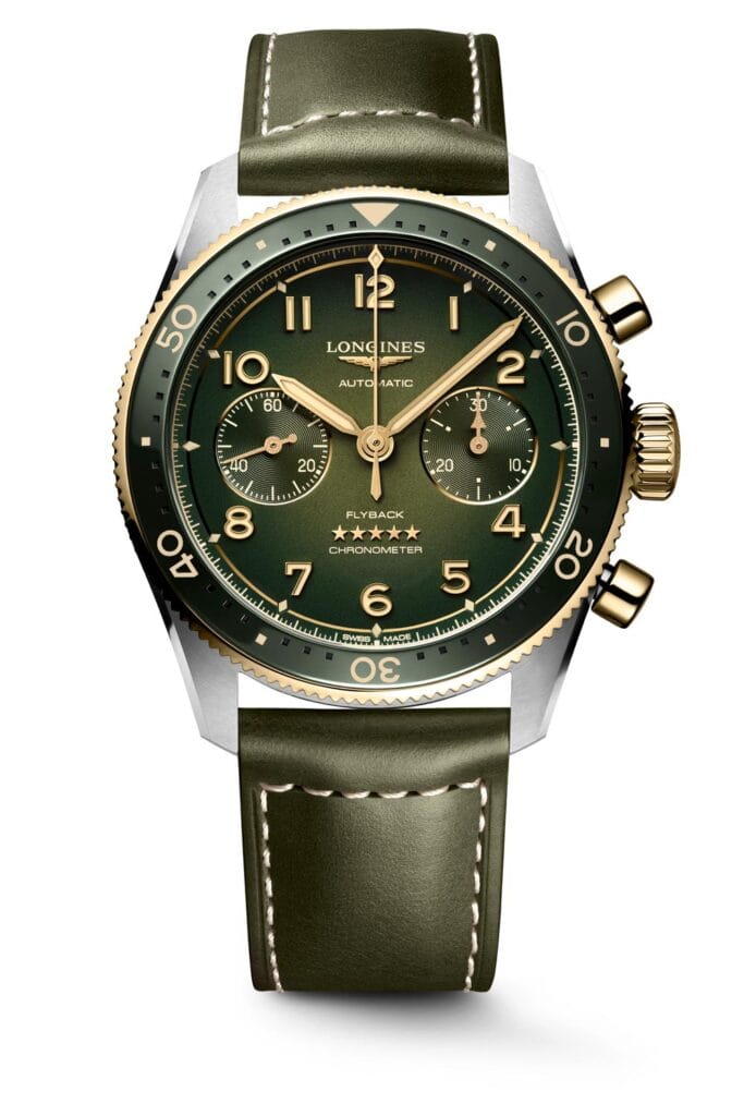 Een tweede en derde release binnen de Longines Spirit-serie zijn de edelstalen Longines Spirit Flyback-modellen met accenten in 18-karaats geelgoud of 18-karaats roségoud. De twee nieuwe Longines Spirit chronografen met flyback-functie hebben een kroon en pushers van 18-karaats goud. Geelgoud voor het model met groene wijzerplaat en roségoud voor het model met bruine wijzerplaat. De bezels zijn afgewerkt in een bijpassende gouden kleur. Beide flyback-modellen worden geleverd met een leren band in de kleur die bij de wijzerplaat past: groen of bruin.