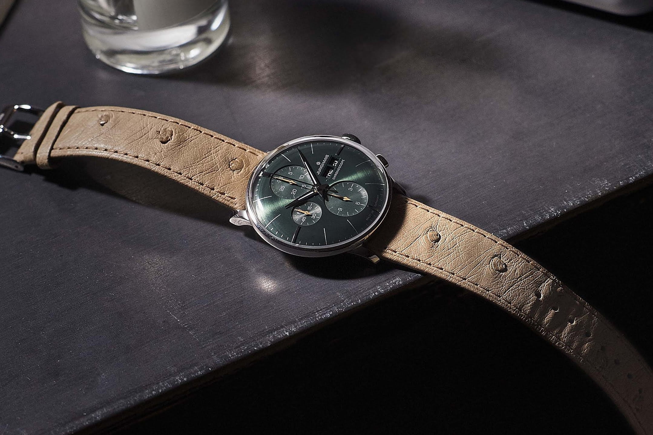 De subdials van de Junghans Meister Chronoscope zijn altijd iets dieper in de wijzerplaat geslepen, waardoor ze het licht iets anders opvangen, wat de wijzerplaat net wat meer reliëf geeft. Wie goed kijkt, ziet dat de wijzers bij deze nieuwe editie goud gekleurd zijn (wat overigens wat anders is dan massief goud). De urenindexen zijn knap fijnzinnig opgelegd en steken mooi af tegen de dennengroene wijzerplaat die zowaar doet denken aan de afkomst van Junghans – in het Zwarte Woud.