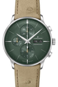 De subdials van de Junghans Meister Chronoscope zijn altijd iets dieper in de wijzerplaat geslepen, waardoor ze het licht iets anders opvangen, wat de wijzerplaat net wat meer reliëf geeft. Wie goed kijkt, ziet dat de wijzers bij deze nieuwe editie goud gekleurd zijn (wat overigens wat anders is dan massief goud). De urenindexen zijn knap fijnzinnig opgelegd en steken mooi af tegen de dennengroene wijzerplaat die zowaar doet denken aan de afkomst van Junghans – in het Zwarte Woud.