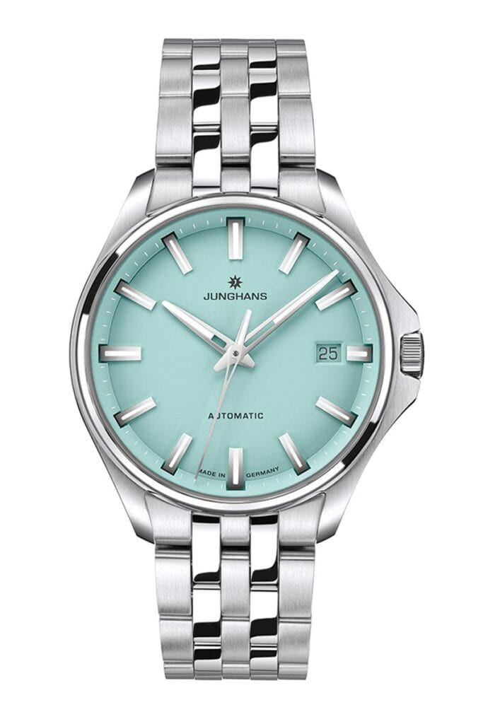 Het horloge is uitgerust met het automatische kaliber J800.1, dat een gangreserve van 38 uur levert en is voorzien van een datumfunctie. Aan de achterzijde sluit een zevenvoudig geschroefde stalen kastdeksel de boel stevig af – voorzien van het iconische Junghans-sterlogo. Dankzij een waterdichtheid tot 10 bar is dit model bestand tegen regenbuien, zwembadmomenten en actieve dagen in de buitenlucht. De kroon is bovendien goed beschermd door twee gebogen zijkanten, wat de robuustheid verder onderstreept.