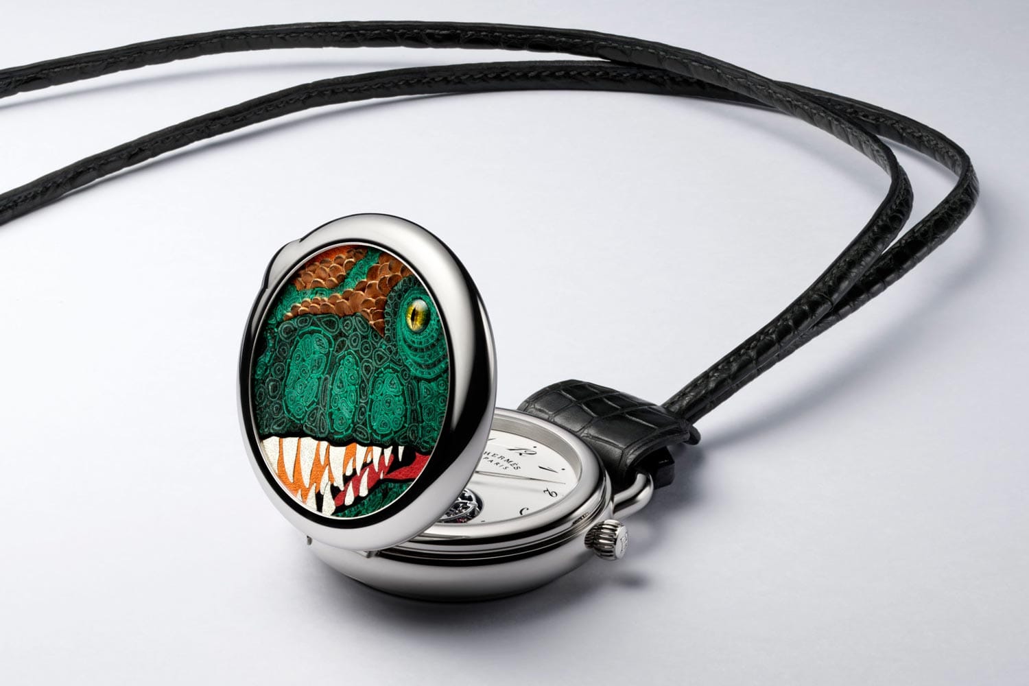 Naast dit zakhorloge maakte Hermès overigens ook modellen met paarden en… dinosauriërs. Zo staat de Arceau Pocket Cheval Punk in het teken van een onconventioneel ‘punkpaard’, gebaseerd op een zijden Hermès-sjaal voor mannen. Deze werd in 2021 ontworpen door Daiske Nomura. Op de Arceau Pocket met de merkwaardige naam Aaaaargh prijkt zowaar een groene of rode T-Rex, ontworpen door de Engelse kunstenaar Alice Shirley. Van elk is er maar één gemaakt. Terwijl de cover met de snuit van de dino die door een patrijspoort lijkt te gluren, nog enigszins grappig aandoet, is het horloge onder de klep een zeer serieuze zaak. Het horloge wordt namelijk aangedreven door Manufacture H1924 met minute repeater en is voorzien van een vliegende tourbillon. Geen kinderspel!