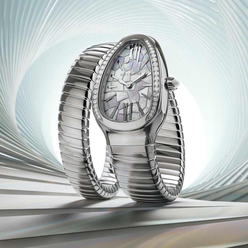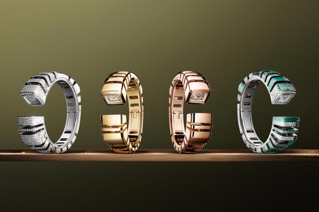 Zeg je sieraadhorloges, dan zal de naam van Bvlgari ook zeker vallen. Een opvallende verschijning bij het Italiaanse luxehuis is natuurlijk de veelvoorkomende slang. Ook dit jaar leverde Bvlgari daar weer drie schitterende exemplaren van af: de Serpenti Misteriosi Pallini. Deze drie verleidelijke en chique serpenten, met hypnotiserende smaragdgroene ogen, zijn sieraadhorloges waar je u tegen zegt. Het mystieke wezen dat in staat is tot eeuwige wedergeboorte, is al sinds 1948 het ‘huisdier’ van Bvlgari. De drie nieuwe varianten zijn er in geel-, rosé- of witgoud en natuurlijk bedekt met een veelvoud aan diamanten. Afhankelijk van de variant is de wijzerplaat gemaakt van parelmoer of bedekt met pavé-gezette diamanten. Ook het vermelden waard is de nieuwe Bvlgari Serpenti Tubogas ontworpen door niemand minder dan de Japanse toparchitect Tadao Ando. En de beste man maakte er meteen maar vier: voor elk jaargetijde één. Zomer (Natsu) is er in tweekleurig geelgoud en staal met groene aventurijnen wijzerplaat. Herfst (Aki) is roségoud met tijgeroog. Winter (Fuyu) is gemaakt van staal met wit parelmoer. En lente (Haru) is gemaakt van tweekleurig roségoud en staal met roze parelmoeren wijzerplaat. Vooral de wijzerplaten ademen Ando uit. In plaats van een glad oppervlak hebben ze Ando’s visie op het gebruik van steen – niet voor niets is hij The King of Concrete – geïmplementeerd. Zodoende komen de wijzerplaten eigenlijk nog reptielachtiger over.