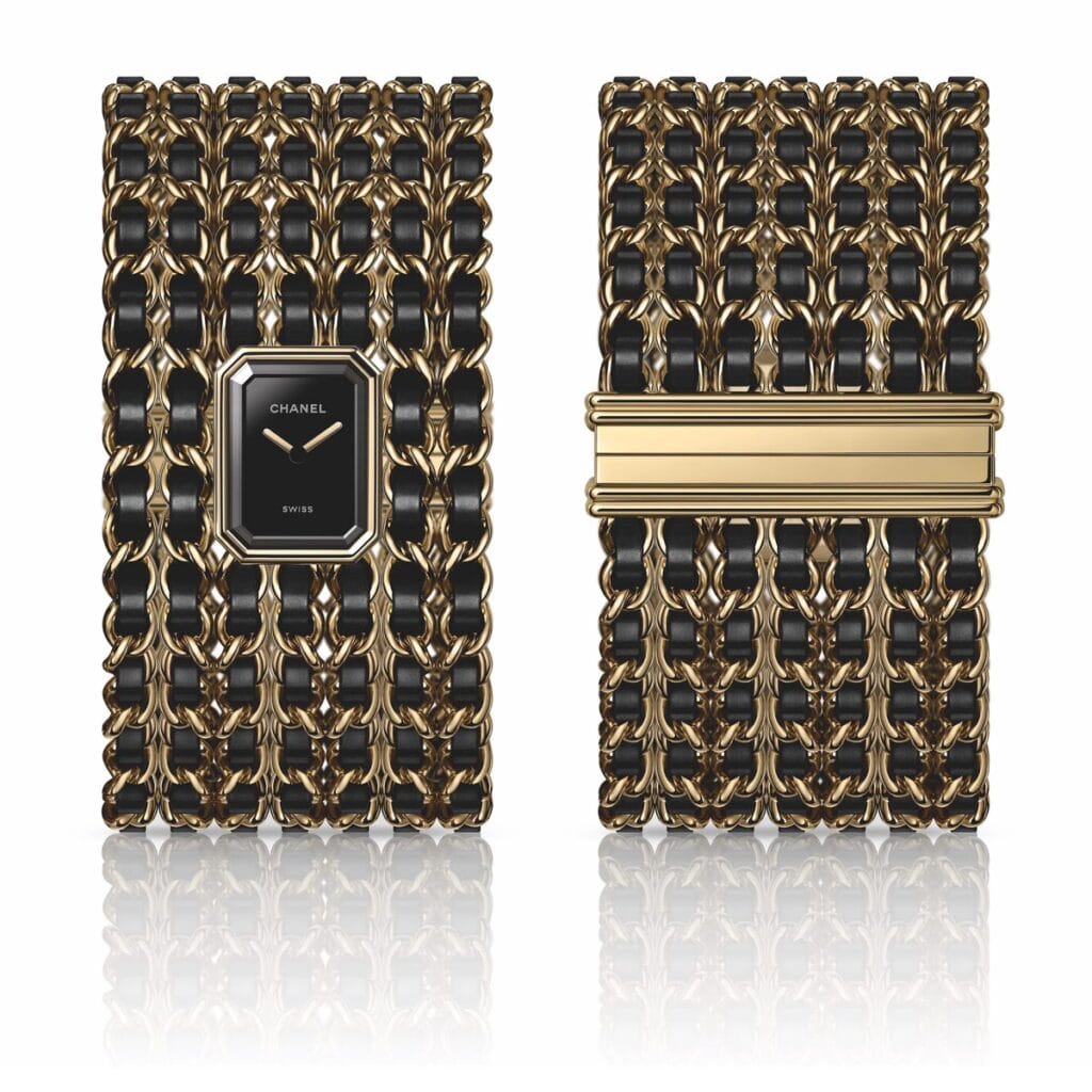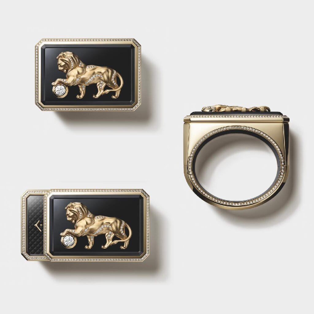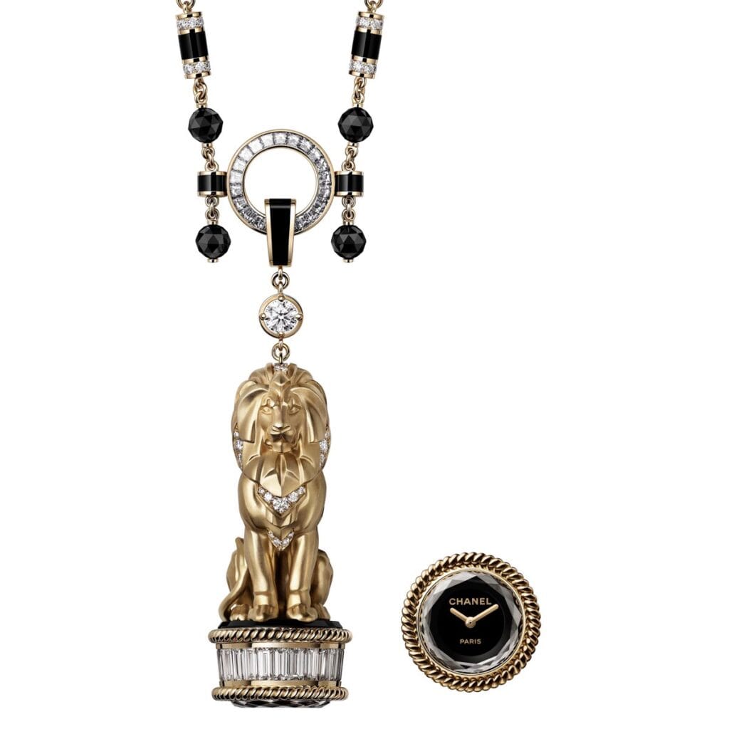Ook in de Mademoiselle Privé Pique-Aiguilles-collectie speelt het atelier een rol. Elke creatie is eigenlijk een opvallende oversized horlogekast met gewelfd kristalglas en doet zo denken aan een speldenkussen. De diverse modellen zijn er als sautoir, ring of armband en zien er op het eerste oog dus uit als sieraad, maar doen toch ook echt dienst als horloge. Qua materiaal wordt er niet bezuinigd: de vijf modellen zijn gemaakt van achttien karaat goud en versierd met diamanten, parelmoer en/of onyx. In de Première-lijn vinden we altijd weer bijzondere creaties. En laat het maar aan Chanel over om ons te verbazen. Want verbazingwekkend is de Première Cuff Watch: een schitterend manchet-horloge met diezelfde mix van doorvlochten zwart leer en een coating van achttien karaats geelgoud. Bovenop prijkt het achthoekige kwartshorloge als een soort edelsteen. In de collectie Le Temps du Lion staat het sterrenbeeld van Coco centraal. Er zijn twee manchetarmbanden met achttien karaats goud en diamanten waarin het horloge verstopt zit. Dat geldt ook de sautoirs die versierd zijn met diamanten en onyx. Het lange collier met de zittende leeuw is de echte blikvanger. Op de onderkant vinden we het horloge.