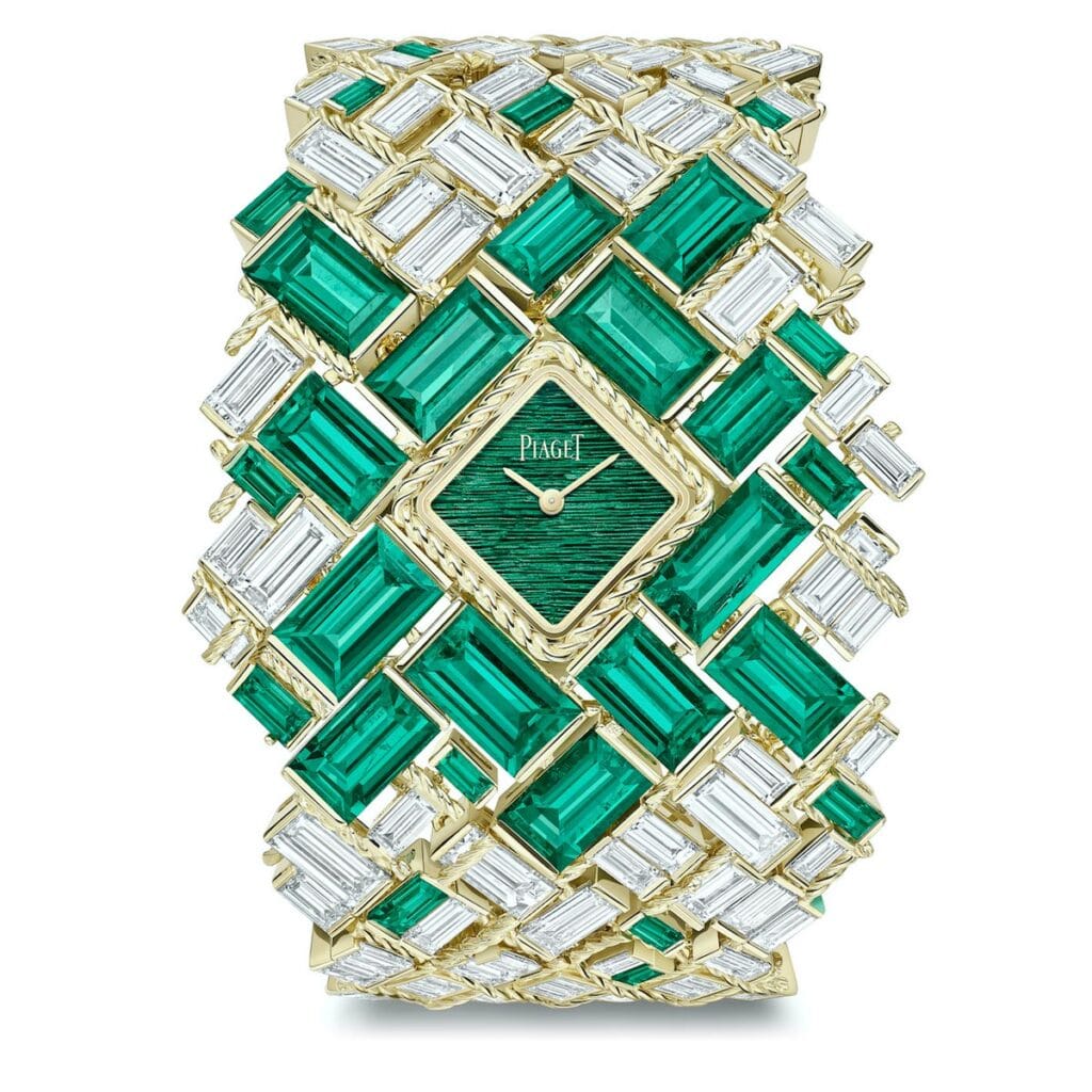 Alle items zijn regelrechte blikvangers, maar we willen graag een paar sieraadhorloges uitlichten. Zo zijn er drie nieuwe Swinging Sautoirs voorzien van horloges, waarvan er twee transformeerbaar zijn om ook om de pols te dragen. Opvallend zijn de met de hand gedraaide gouden kettingen die worden verankerd met het horloge. Elke Swinging Sautoir-kast heeft een nieuwe, zacht afgeronde trapezekast, een knipoog naar de vorm van de kasten uit de originele collectie uit 1969. Het goud wordt onder andere gemixt met malachiet-, turquoise kralen, gele saffieren en briljantgeslepen diamanten, een zeldzame gele saffier van 29,24 karaat uit Sri Lanka en een aquamarijn van 6,11 karaat en caleidoscopische witte opaal, om maar een paar bijzondere features te benoemen. In 1969 introduceerde Piaget ook het manchethorloge en logischerwijs is ook daarvan een schitterend nieuw exemplaar gelanceerd met manchetten van grafisch opengewerkt goud, zwaar getextureerde gouden armbanden en levendig gekleurde wijzerplaten. Ook een transformeerbare cuff-armband met gouden en diamanten franjes met een geweldige turquoise wijzerplaat wilden we u niet onthouden.