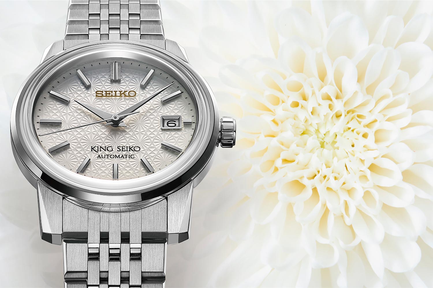 De iconische King Seiko-lijn krijgt een nieuw, bijzonder familielid: een uitvoering met een wijzerplaat in de vorm van een gestileerde chrysant, de bloem die ook het keizerlijke zegel van Japan siert.