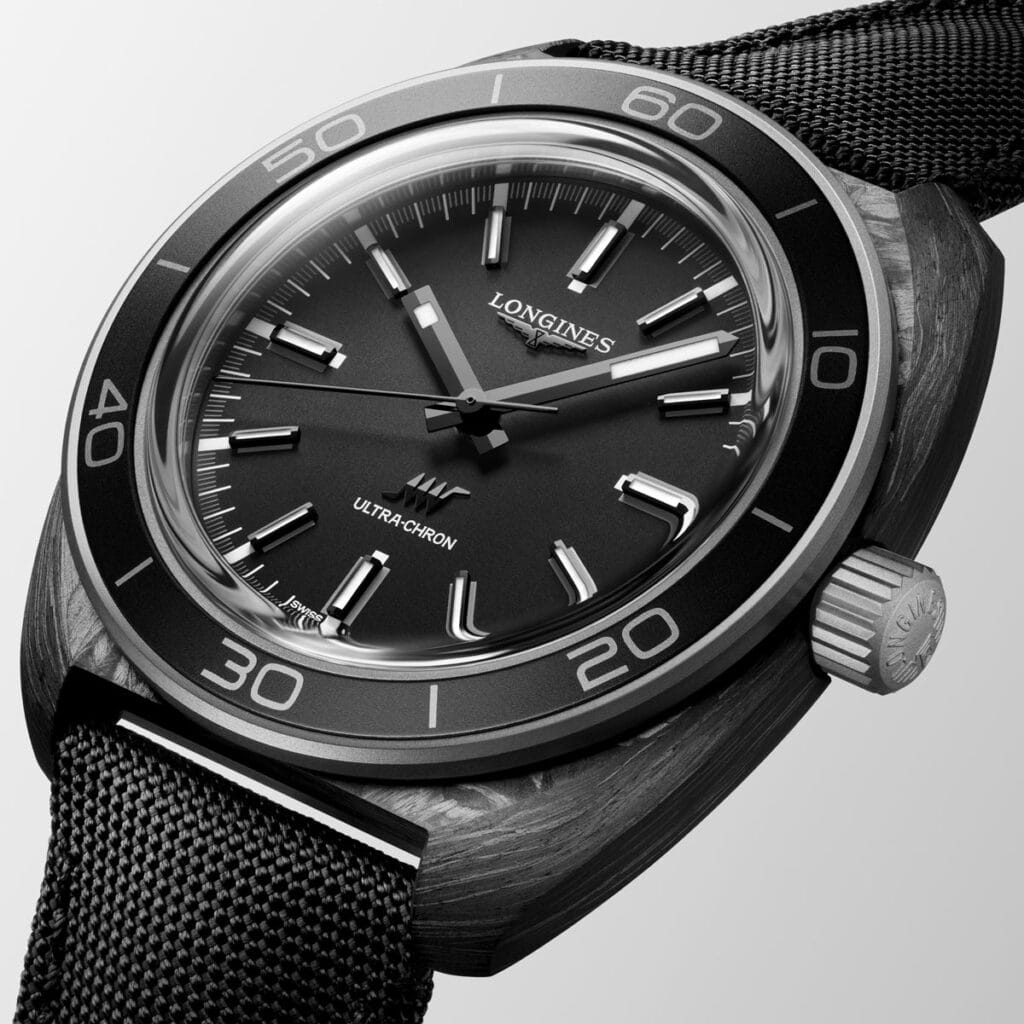 Longines vervaardigde de 43 mm kast van de Ultra-Chron Carbon uit koolstofvezel en epoxyhars, wat resulteert in een gewicht van minder dan 80 gram (inclusief band). Het high-tech materiaal – bekend uit de luchtvaart – biedt niet alleen uitzonderlijke sterkte, maar ook een unieke visuele identiteit dankzij de willekeurige vezelpatronen. In het ontwerp is het cushion-design uit het origineel uit de jaren zestig grotendeels overeind gebleven.