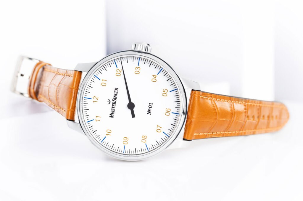 De MeisterSinger №01 met witte wijzerplaat is, net als de №01 met ivoren en blauwe wijzerplaat, uitgebracht met een 43 millimeter edelstalen kast. De hoogglans witte wijzerplaat is voorzien van gouden cijfers en blauwe uurmarkeringen. De N°01 met witte wijzerplaat wordt aangedreven door het Zwitserse handgewonden Sellita SW210 uurwerk, dat speciaal is aangepast voor de eenwijzerhorloges van MeisterSinger. Het horloge is voorzien van een rundlederen armband met kroko-print in de kleur cognac.