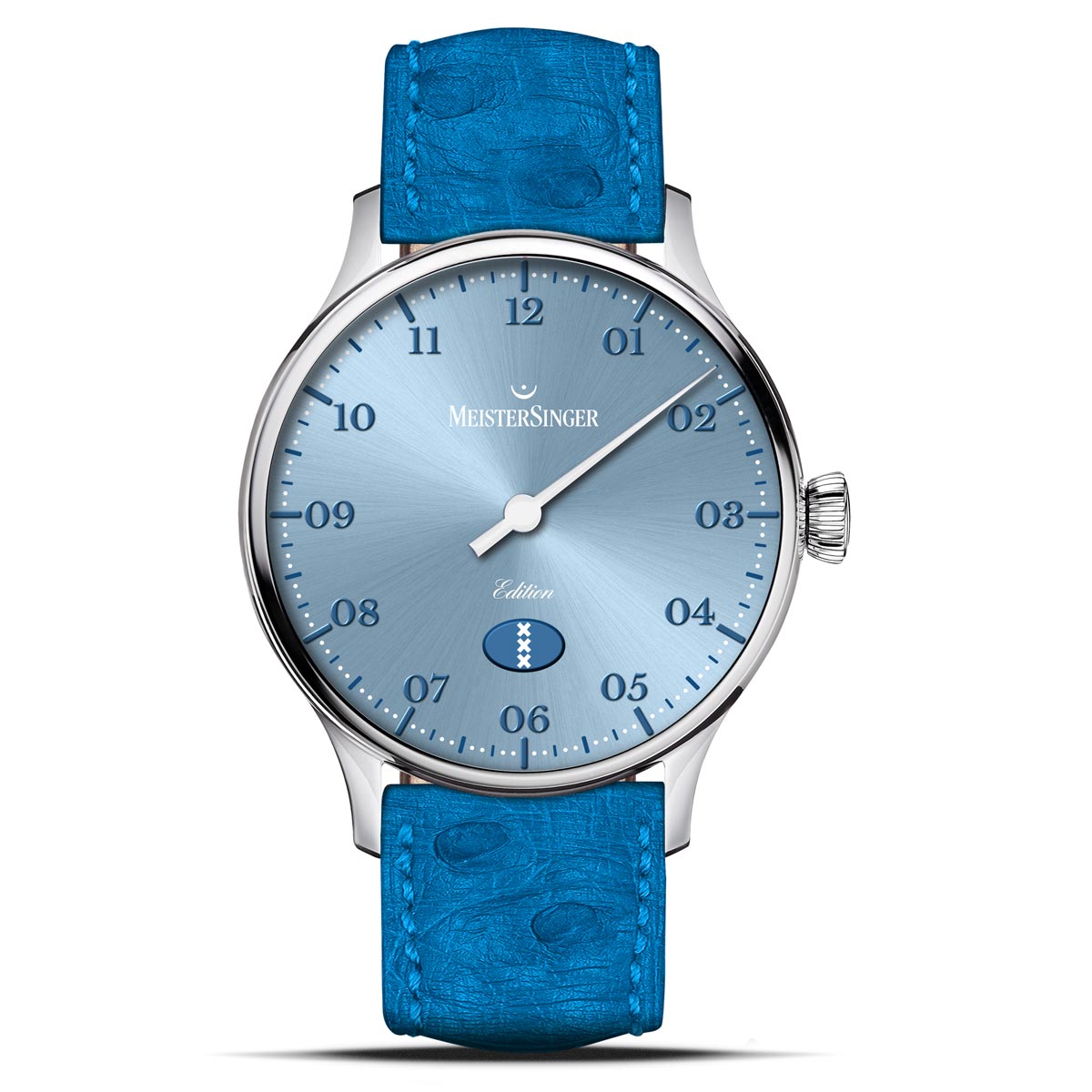 Als fundament dient de elegante Pangaea, uitgevoerd in een compacte 40 millimeter kast. De lichtblauwe wijzerplaat met sunburst-afwerking speelt met het licht en verandert continu van karakter, terwijl donkerblauwe accenten zorgen voor diepte en rust. De kenmerkende eenwijzer beweegt in alle kalmte over de wijzerplaat en benadrukt de filosofie van het merk, tijd hoeft niet op de seconde nauwkeurig te worden beleefd.
