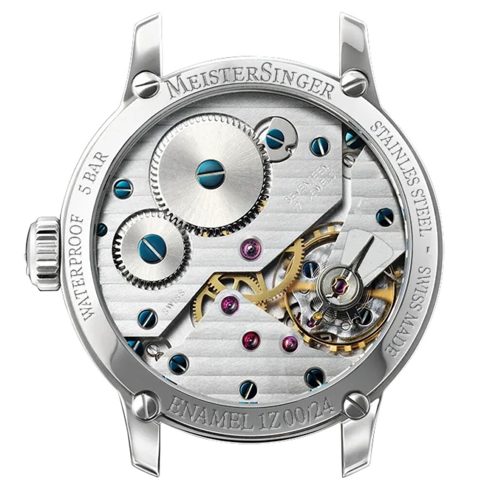 In 2004 bracht MeisterSinger de Edition 1Z uit, het eerste horloge van het merk met een geëmailleerde wijzerplaat. Dit horloge had eveneens een zakhorlogekaliber: het Unitas 6497 kaliber. Ook in de 2024 MeisterSinger Editie Emaille 1Z is een hoofdrol weggelegd voor een zakhorlogekaliber, ditmaal kaliber ETA/Unitas 6498. Beide handmatig opwindbare uurwerken, de Unitas 6497 en 6498, met een gangreserve van 46 uur, werden al in de jaren ’50 geïntroduceerd. Via het transparante kastdeksel van de MeisterSinger Editie Emaille 1Z zijn details zoals de Côtes de Genève-afwerking, de geblauwde schroeven en een Glucydur schroefbalans van kaliber 6498 te bewonderen.