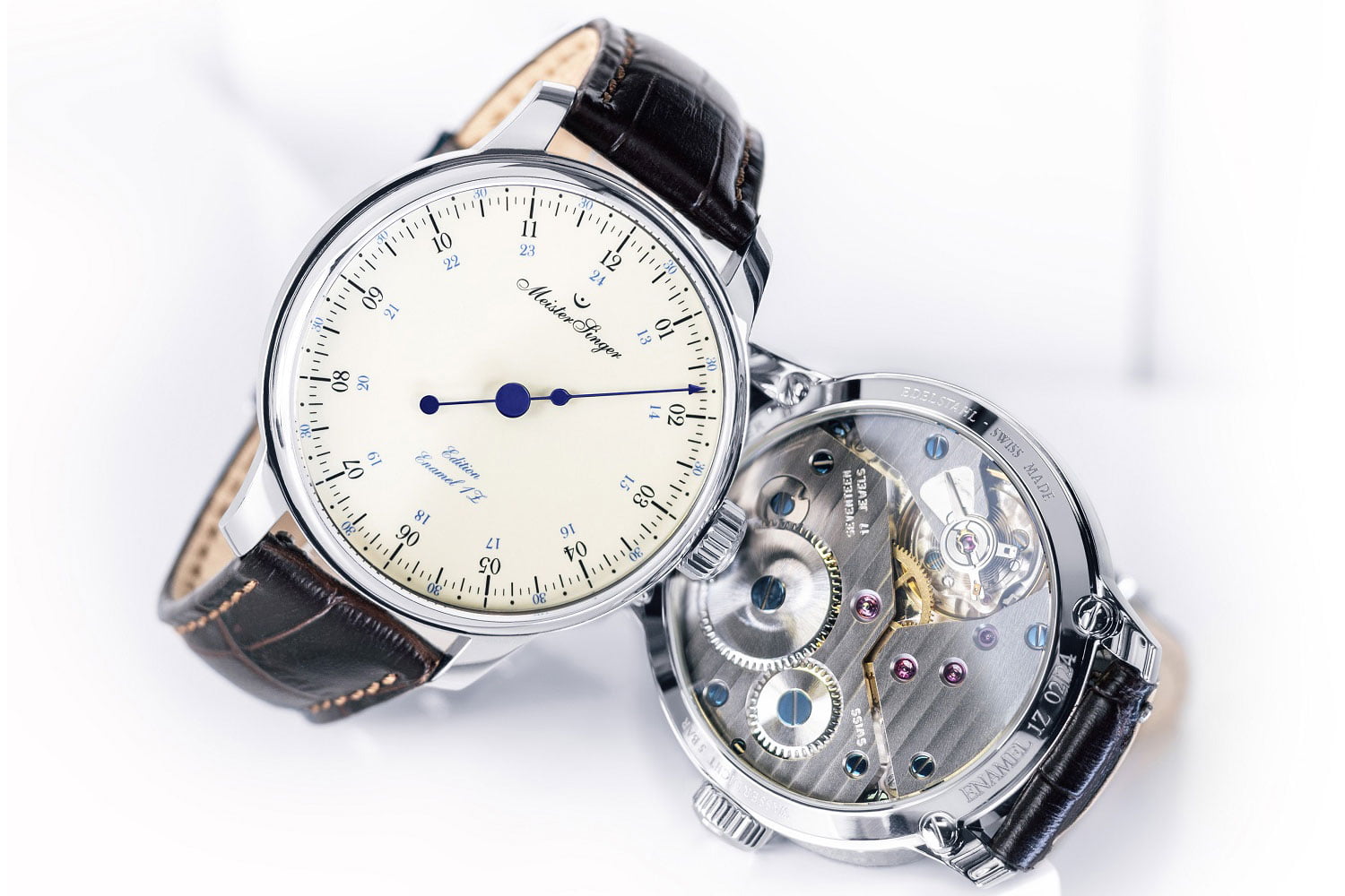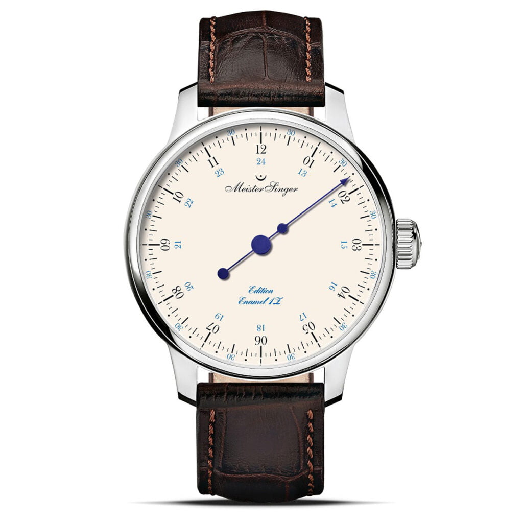 De MeisterSinger Editie Emaille 1Z meet 43 millimeter en wordt geleverd met een bruine rundlederen band met krokoprint en vouwsluiting.