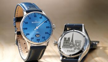 Na een gewaagde gele “mellow yellow” editie variant in 2021 komt de MeisterSinger Perigraph dit jaar als seriehorloge in twee nieuwe kleuren: zwart met bordeaux en petrol groen. Alle varianten hebben gemeen dat de datumschijf volledig 360 graden zichtbaar is, wat de wijzerplaat structureert en diepte geeft. De stalen kast is vrij fors (43 millimeter in diameter), maar valt keurig om de pols dankzij de vorm van de bandaanzet.