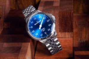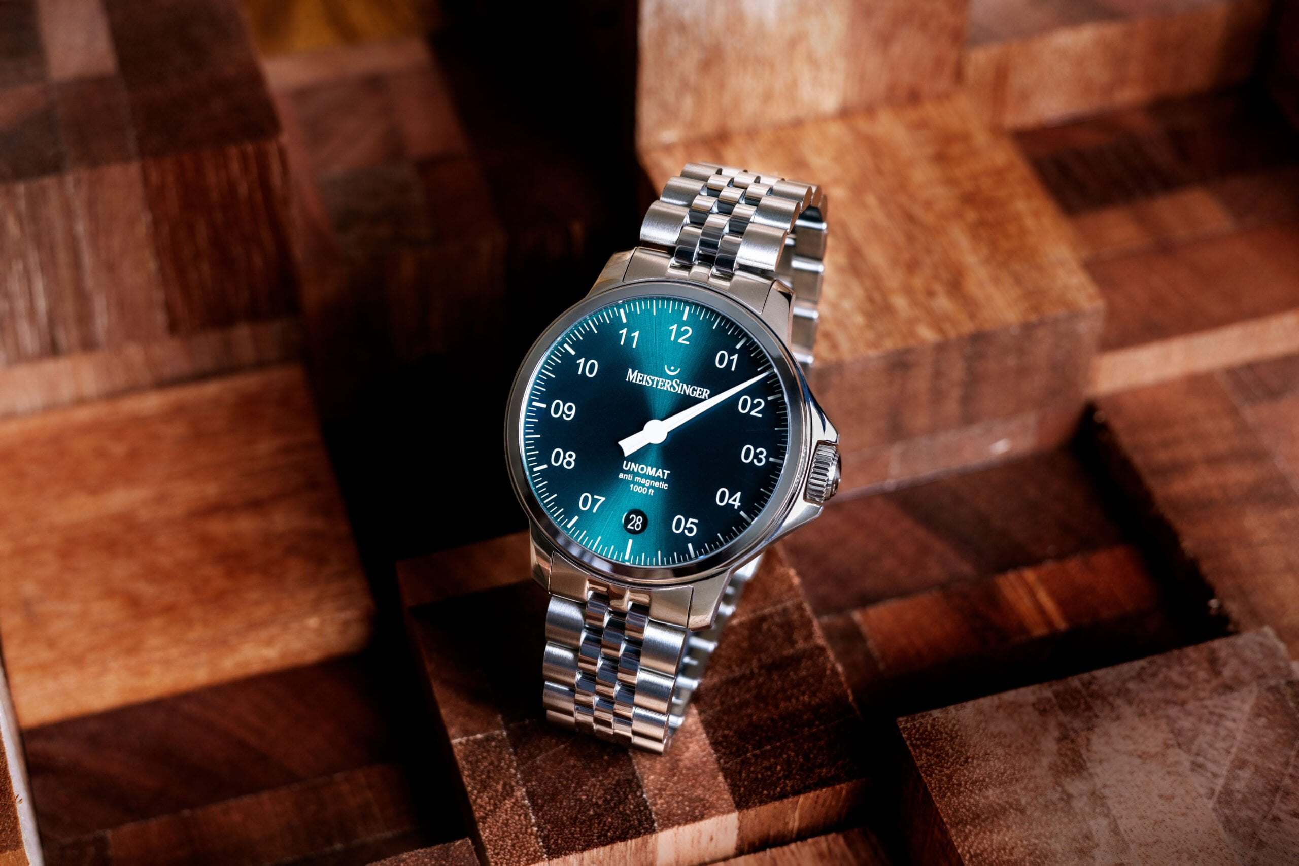 Binnenin de MeisterSinger Unomat tikt overigens het automatische Sellita SW 400 uurwerk, dat een gangreserve heeft van 38 uur en een datumaanduiding.