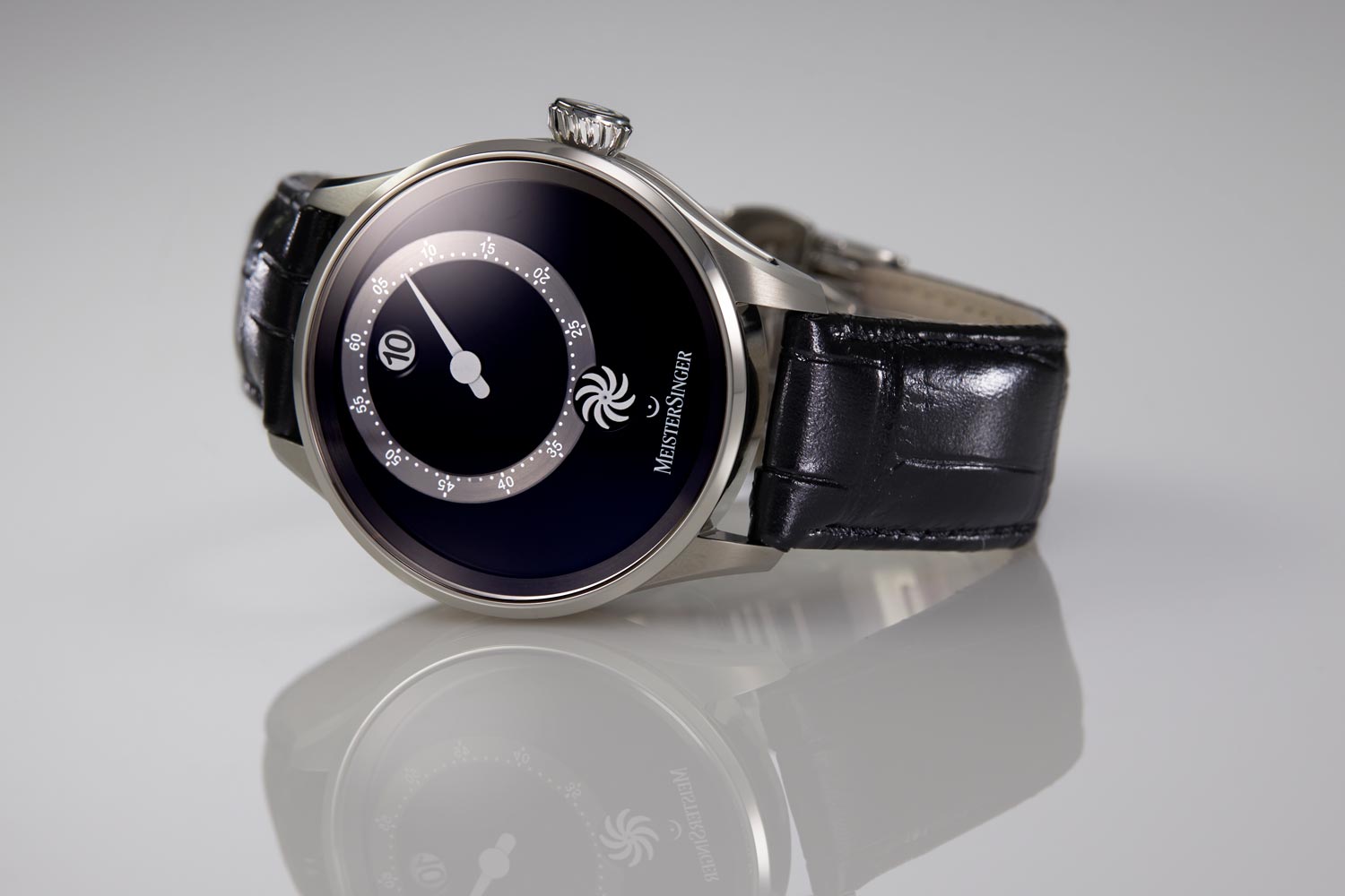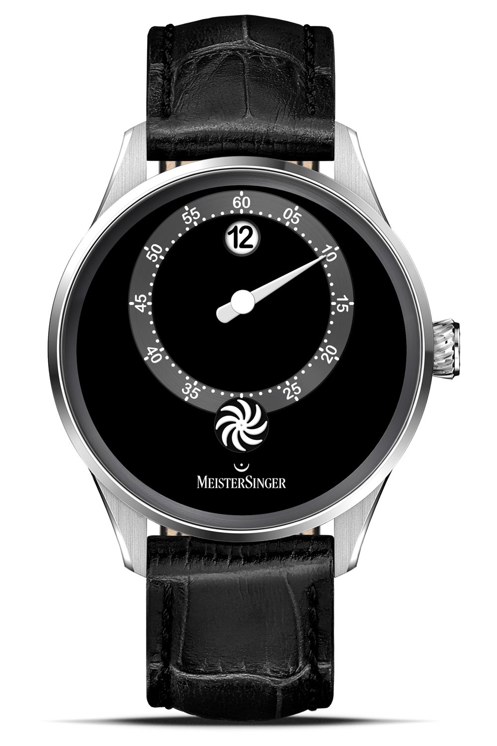 Een draaiend zonsymbool, geïnspireerd op de MeisterSinger-fermate, beweegt continu mee op de wijzerplaat. Het meet niets en telt niets, maar maakt het verstrijken van de tijd visueel voelbaar. Dit bijna meditatieve element onderstreept de filosofie van het merk: tijd bewust beleven in plaats van najagen.