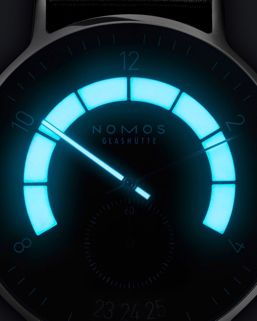 The design of the watch is inspired by the dashboard of vintage (German) cars and comes with a few surprising details. The arc that gives the watch its characteristic looks is actually luminova and glows up in the dark, together with the hour hand. The dial itself is curved like a bowl, as is the sub seconds dial. These are the details that make this watch quite captivation, while it also doesn’t make any concessions to its easy readability, another Nomos hallmark.