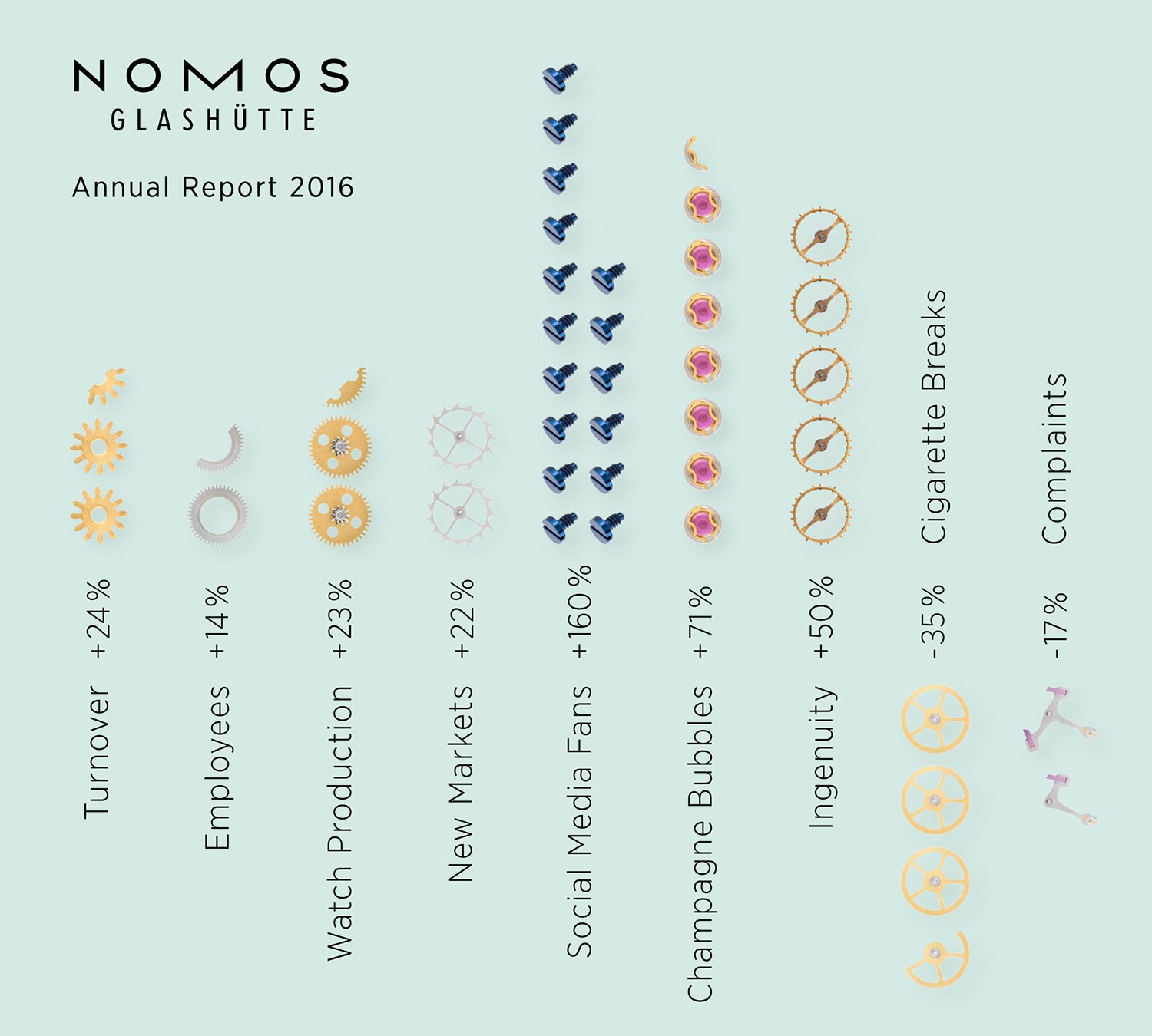 More watches made. more turnover, more fans on social media, everything’s on the rise at Nomos Glashütte as we can see in their quirky 2016 report. Well, not everything. Cigarette breaks are down substantially, but that’s a big up too.