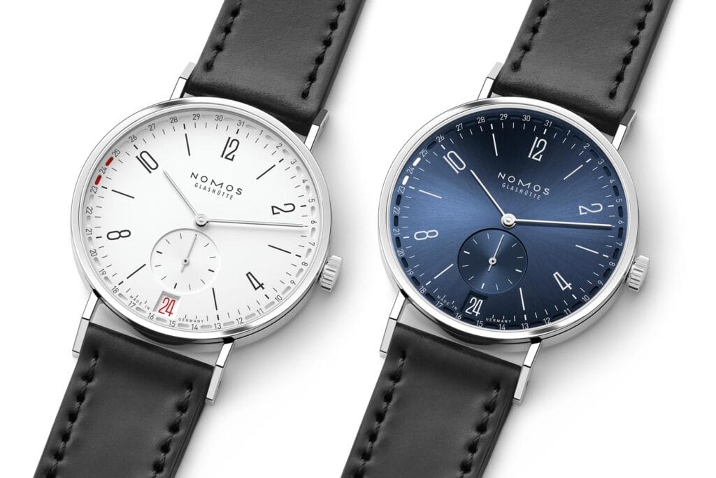 Het innovatieve, nieuwe uurwerk van de Tangente 2date doet niets af aan het geliefde ontwerp van de Tangente. De twee modellen hebben een edelstalen kast van 37,5 millimeter en een waterbestendigheid tot 5 bar. Er is een model met een witte, verzilverde wijzerplaat (ref. 135) en een galvanisch blauwe variant (ref.136) met sunburst wijzerplaat, die het licht prachtig weerkaatst. Beide wijzerplaten hebben NOMOS’ kenmerkende, strakke typografie, die zorgt voor een heldere leesbaarheid en een evenwichtig ontwerp. Op de witte wijzerplaat wordt naast de klassieke datumweergave op 6 uur ook in de ring rondom de wijzerplaat de datum in rood weergegeven. Voor de blauwe versie is gekozen voor een ton-sur-ton kleurstelling met witte typografie.
