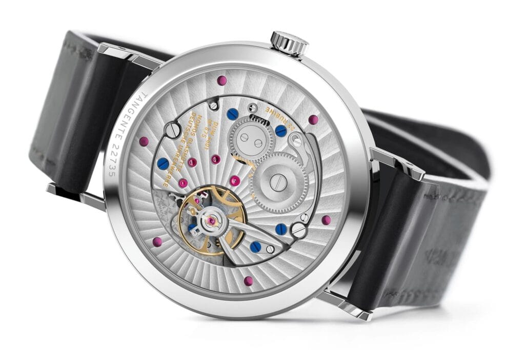 De dubbele datumfunctie benadrukt het technische hoogstandje dat de DUW 4601 is, dat ook nog eens een indrukwekkende gangreserve van 52 uur heeft. En wanneer je dan een nieuw uurwerk presenteert, wil je dat het bewonderd kan worden. De Tangente 2date voldoet hieraan dankzij een transparant achterkant met helder en krasbestendig saffierglas. De vele NOMOS-fans kunnen zo de complexe en verfijnde bewegingen van het uurwerk bewonderen.