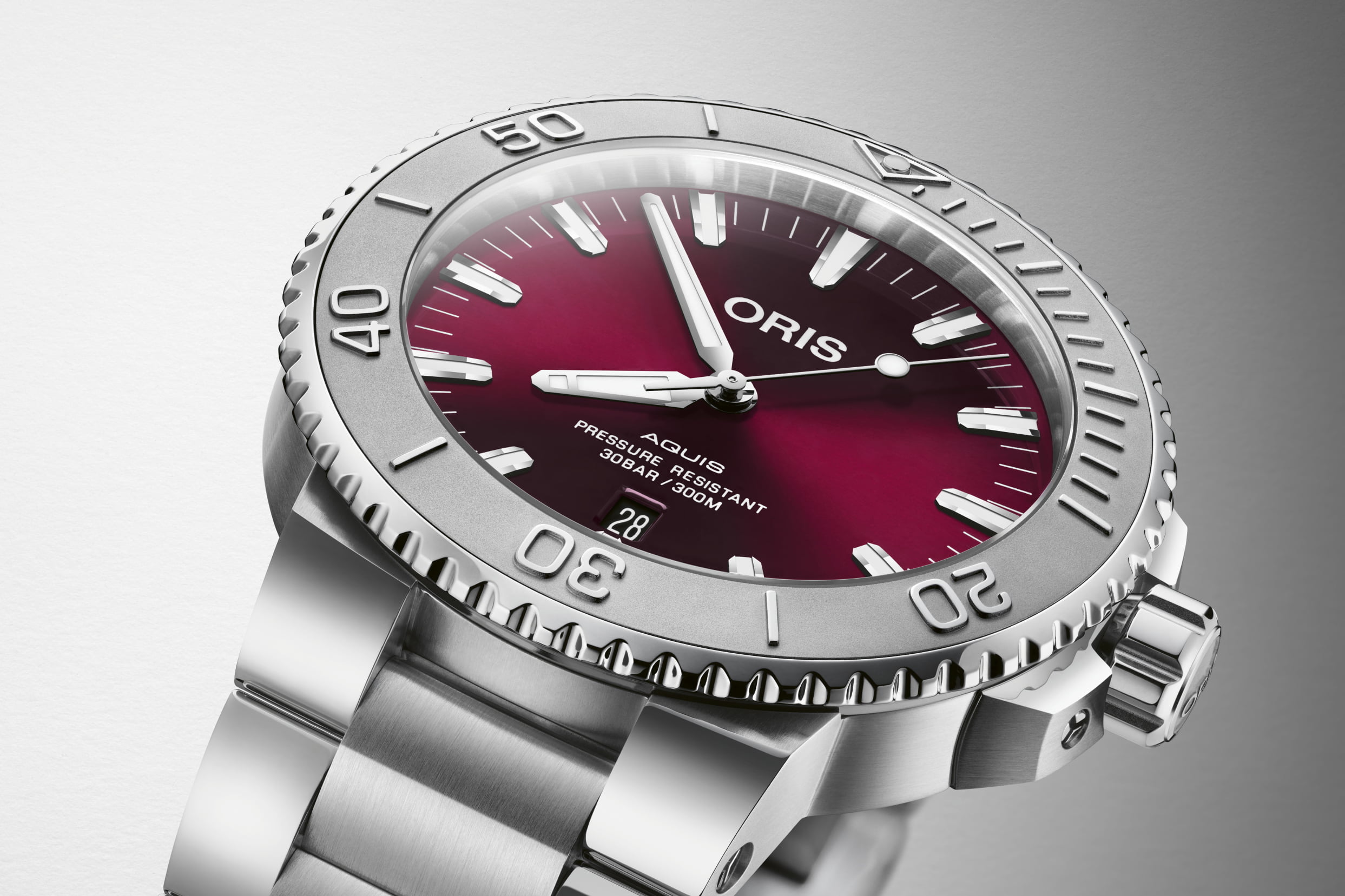 Goed, helemaal nieuw is het idee niet; vorig jaar introduceerde zagen we al de Oris Aquis 41 met een kersenrode wijzerplaat en een stalen kast. Maar die had een diameter van 41,5 millimeter.