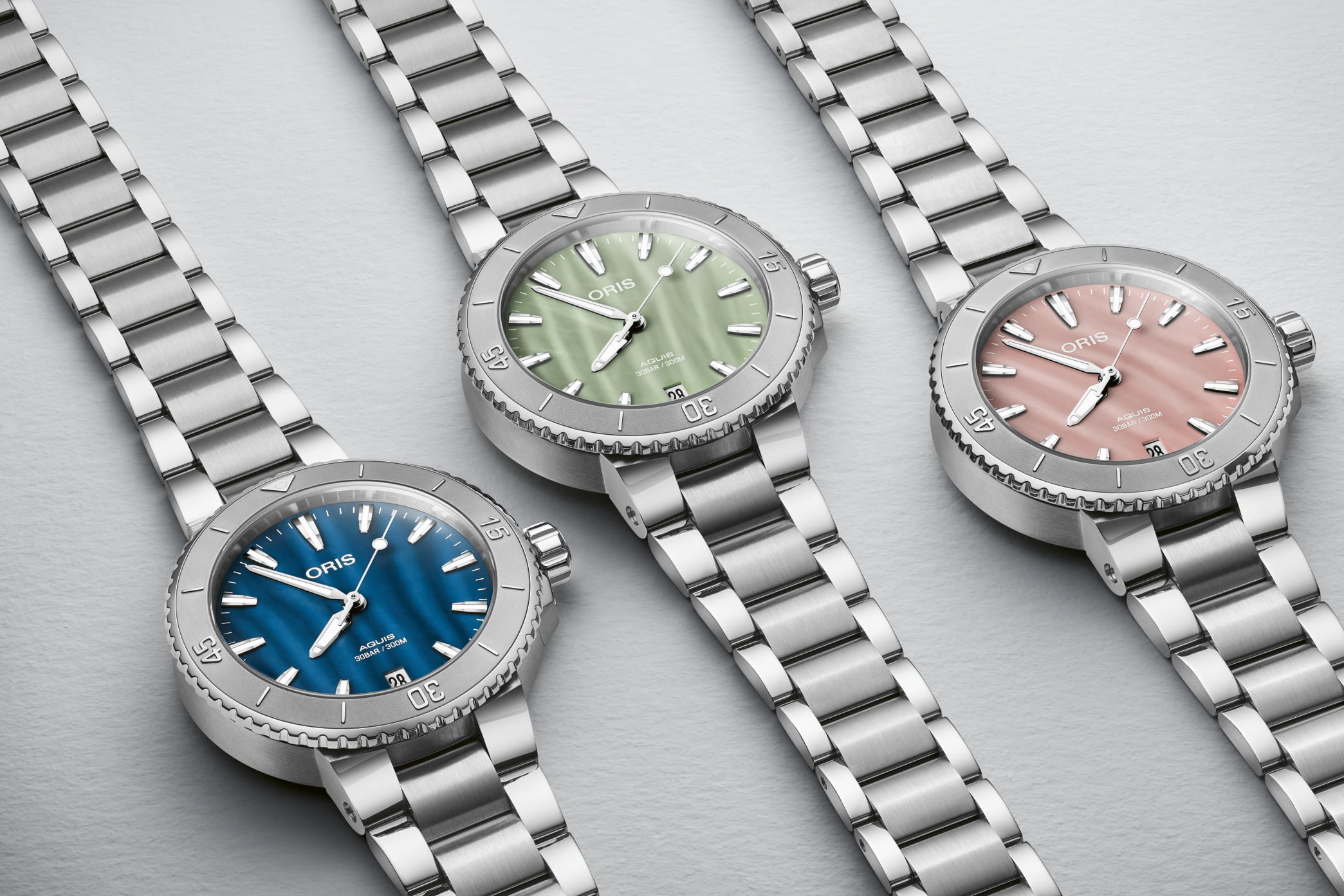 Het bekende, taps toelopende silhouet van de Oris Aquis Date 36 vormt de basis voor elk van de drie stukken, maar ze zullen eerst herinnerd worden vanwege hun contrastrijke Blush Pink, Aegean Blue en Seafoam Green wijzerplaten. Deze zijn gemaakt van parelmoer en glinsteren speels in het licht, zoals het wateroppervlak bij zonsondergang, en voegen een elegante, verfijnde tint toe aan het hoogwaardige profiel van de Aquis. Rondom elke wijzerplaat bevindt zich een doelgerichte roestvrijstalen kast van 36,5 mm die waterbestendig is tot 30 bar (300 meter) en een in één richting draaiende ring met een minutenschaal in reliëf voor timingduiken.
