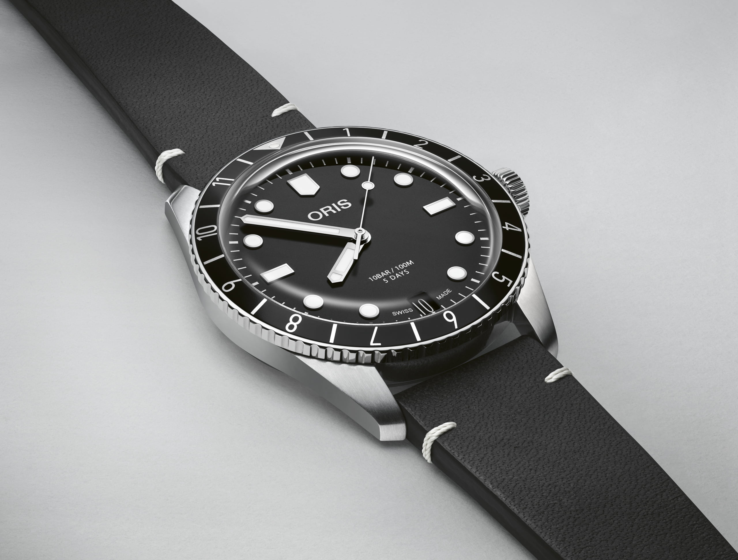 keuze uit een leren band of een metalen armband. De kast van de Oris Divers Sixty-Five 12H Calibre 400 meet een knappe 40 millimeter in doorsnee en het glas is gebold saffier. Het horloge is 100 meter waterdicht.