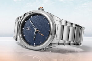 De Parmigiani Fleurier Tonda PF GMT Rattrapante heeft in een stalen kast van een keurige grootte die bij de meeste polsen past, met een diameter van 40 millimeter en een dikte van 10,7 millimeter. De gekartelde ring is gemaakt van 950 platina, terwijl de pusher van de kroon van 18k roségoud is. De minimalistische Milano-blauwe wijzerplaat is versierd met een extreem fijn guilloché-patroon met grain d’orge, met het ovale PF-logo van het merk om 12 uur aangebracht.