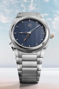 De Parmigiani Fleurier Tonda PF GMT Rattrapante heeft in een stalen kast van een keurige grootte die bij de meeste polsen past, met een diameter van 40 millimeter en een dikte van 10,7 millimeter. De gekartelde ring is gemaakt van 950 platina, terwijl de pusher van de kroon van 18k roségoud is. De minimalistische Milano-blauwe wijzerplaat is versierd met een extreem fijn guilloché-patroon met grain d’orge, met het ovale PF-logo van het merk om 12 uur aangebracht.