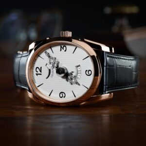 The Ovale Pantographe revealed another secret: rather than making this architecture – where everything moves – more rigid, it required flexibility. This is true of the hands, articulated structures comprising more than 30 elements in continuous movement. Looking at the dial, they appear static. Yet nothing could be further from the truth. There is only one material in the world, an aluminium alloy with a magnesium base used in the automotive industry, able to meet the exacting specifications, whereby no immobility is permitted. To add further complexity to the equation, Parmigiani Fleurier equipped this creation with a movement made entirely from rose gold. It is part of a series of pieces which have enabled the Manufacture to develop specific expertise. The ductility of the gold proved a major constraint when it came to machining the watch. Similarly, polishing, engraving, and creating a shine on a metal which adheres to the tools used to work it meant that brand new techniques had to be employed. The movement of the Ovale Pantographe also boasts an 8-day power reserve. The dial is stamped with a decorative ‘barley grain’ pattern, which adds a further touch of sophistication to this already refined piece. The indices, replacing the transfers used on the previous model, lend it a richness and brilliance. The disc power reserve and the large date window at 6 o’clock complete this harmonious dial. With its Hermès strap and rose gold ardillon buckle, the Ovale Pantographe is available in a limited edition of 50 watches.