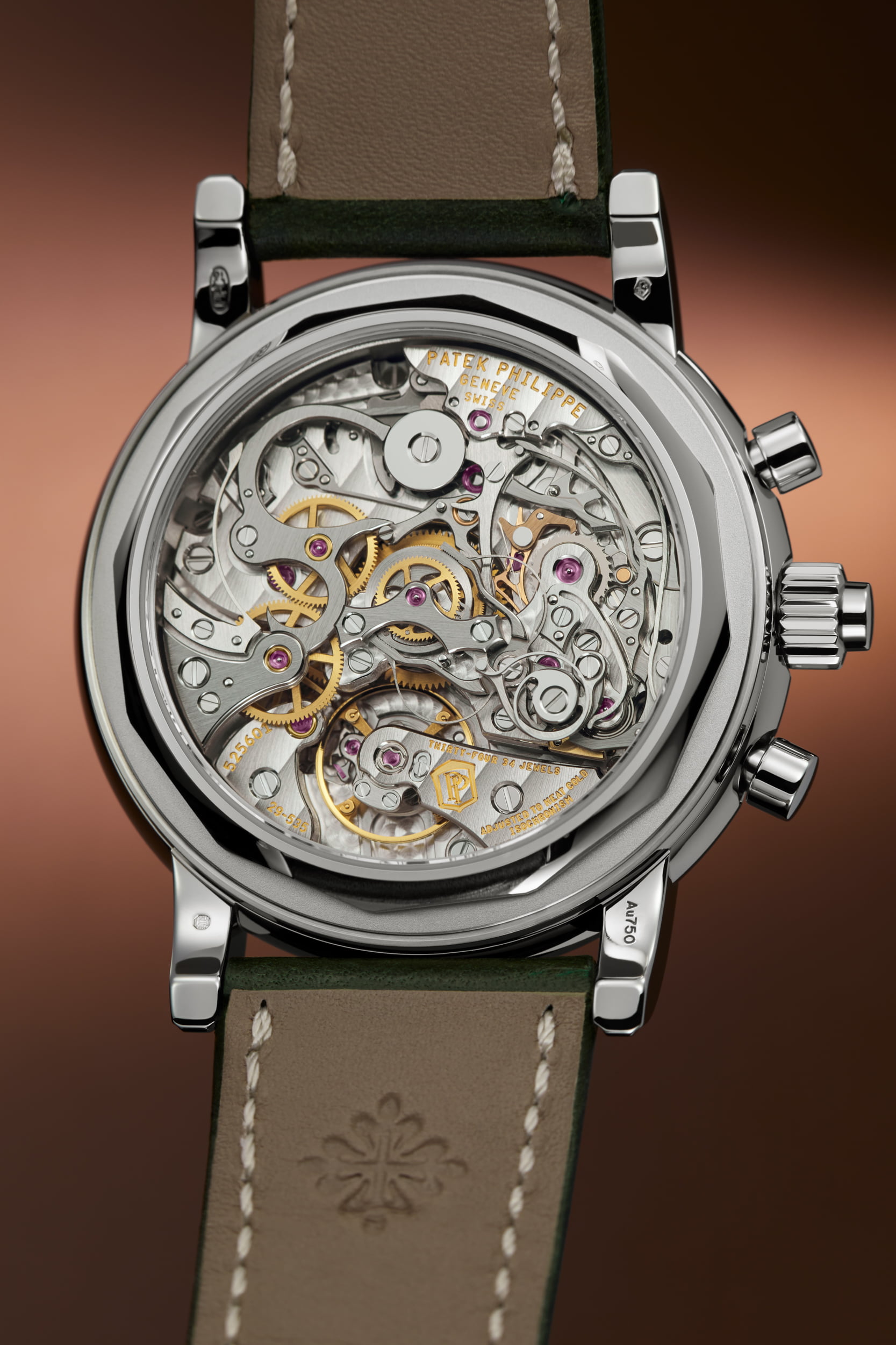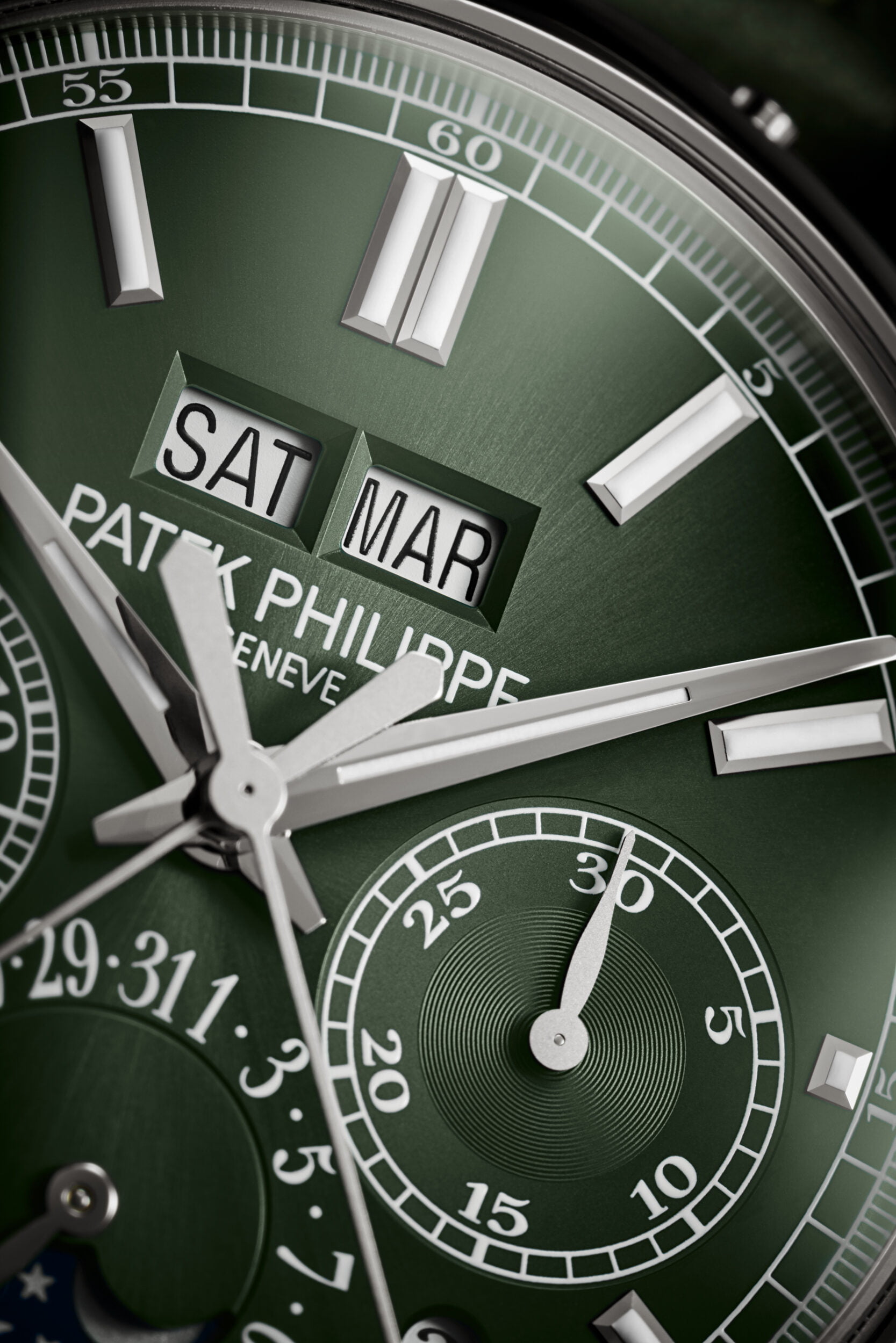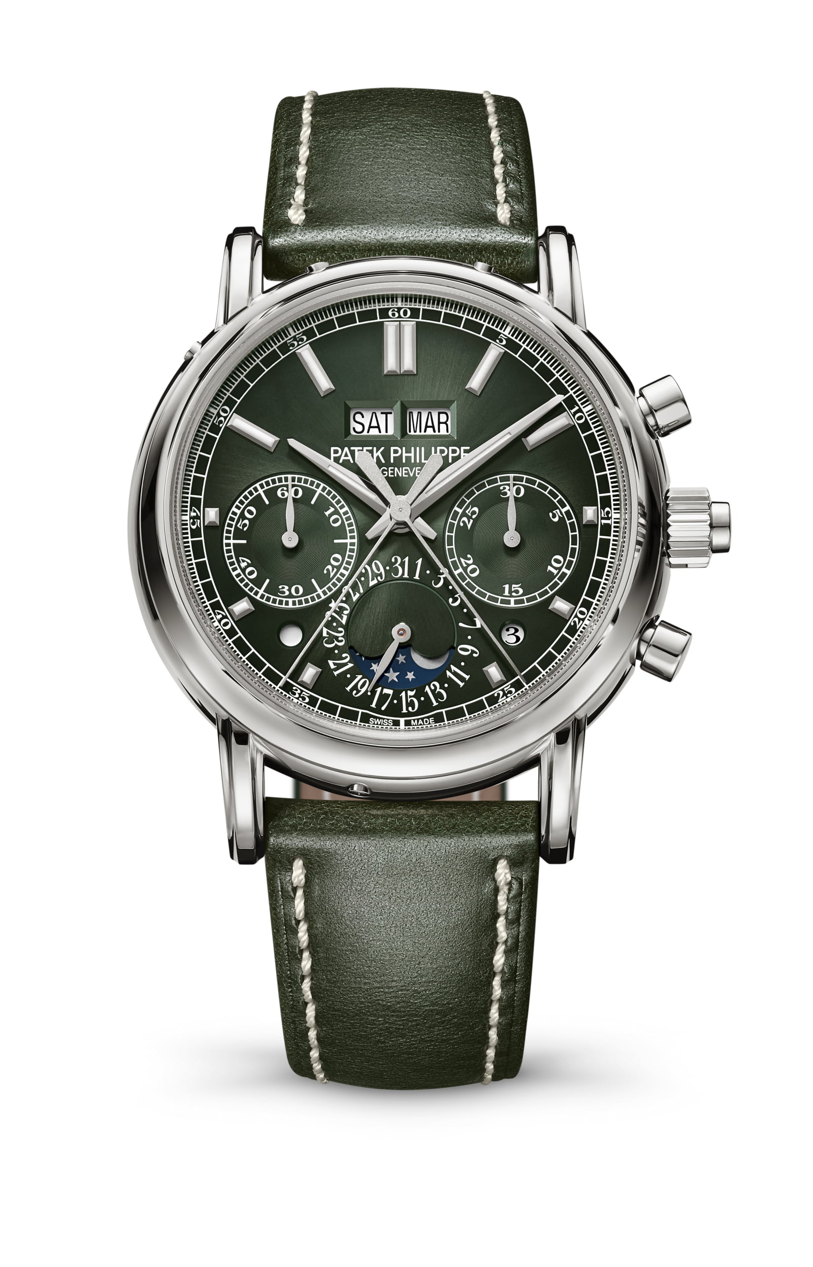 De nieuwe ref. 5204G-001 split-second chronograaf met eeuwigdurende kalender en het handmatig opgewonden kaliber CHR 29-535 PS Q weerspiegelt volledig de traditie van Patek Philippe’s meest begeerde grote complicaties. De onderscheidende kenmerken zijn een witgouden kast en een olijfgroene sunburst wijzerplaat met een zwarte gradatie naar de periferie.
