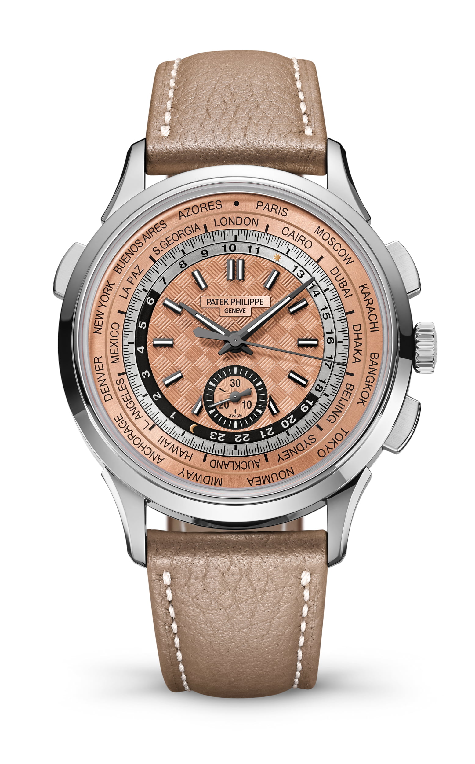De nieuwe zelfopwinder Ref. 5935A-001 World Time flyback-chronograaf met het automatische kaliber CH 28-520 HU is de allereerste roestvrijstalen versie van een cultmodel dat twee typische Patek Philippe-complicaties combineert. De esthetiek van de wijzerplaat werd ook aangepast en heeft dankzij de glinsterende roze vergulde tint nu een prachtige vintage look.\