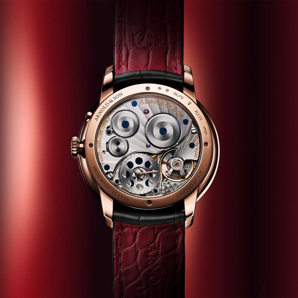 Het uurwerk is uitgerust met twee veertonnen, heeft een frequentie van 3 Hz en biedt een comfortabele gangreserve van circa 90 uur. Een tweede maanfase weergave op de achterzijde van de kast maakt een snelle en nauwkeurige afstelling mogelijk. Zoals bij alle uurwerken van Arnold & Son wordt ook dit kaliber volledig in eigen huis ontwikkeld, vervaardigd, afgewerkt en geassembleerd in La Chaux-de-Fonds, met aandacht voor traditionele decoraties en hoogwaardige afwerking.
