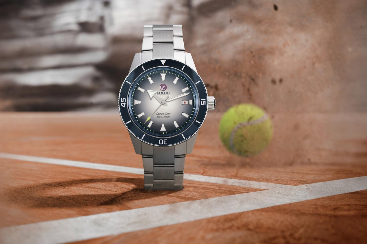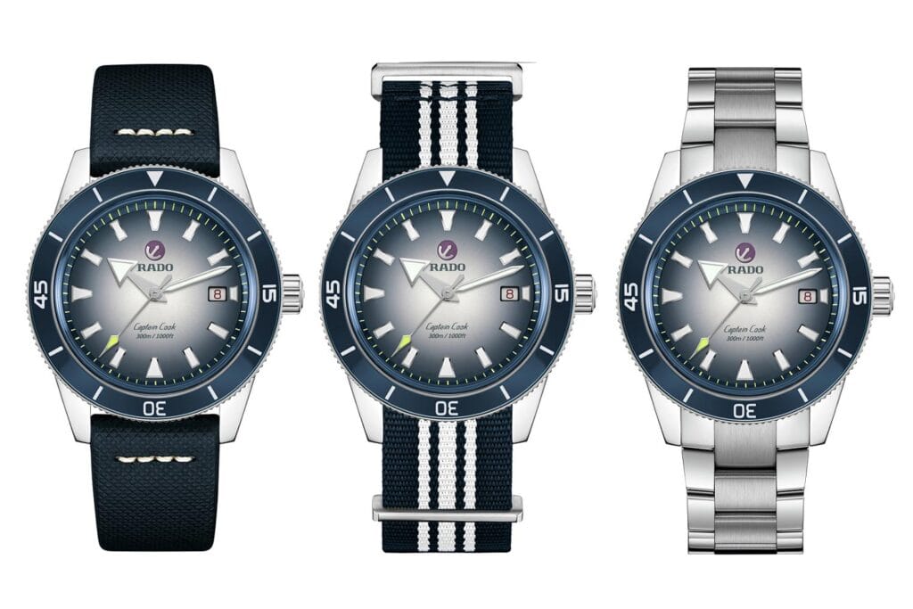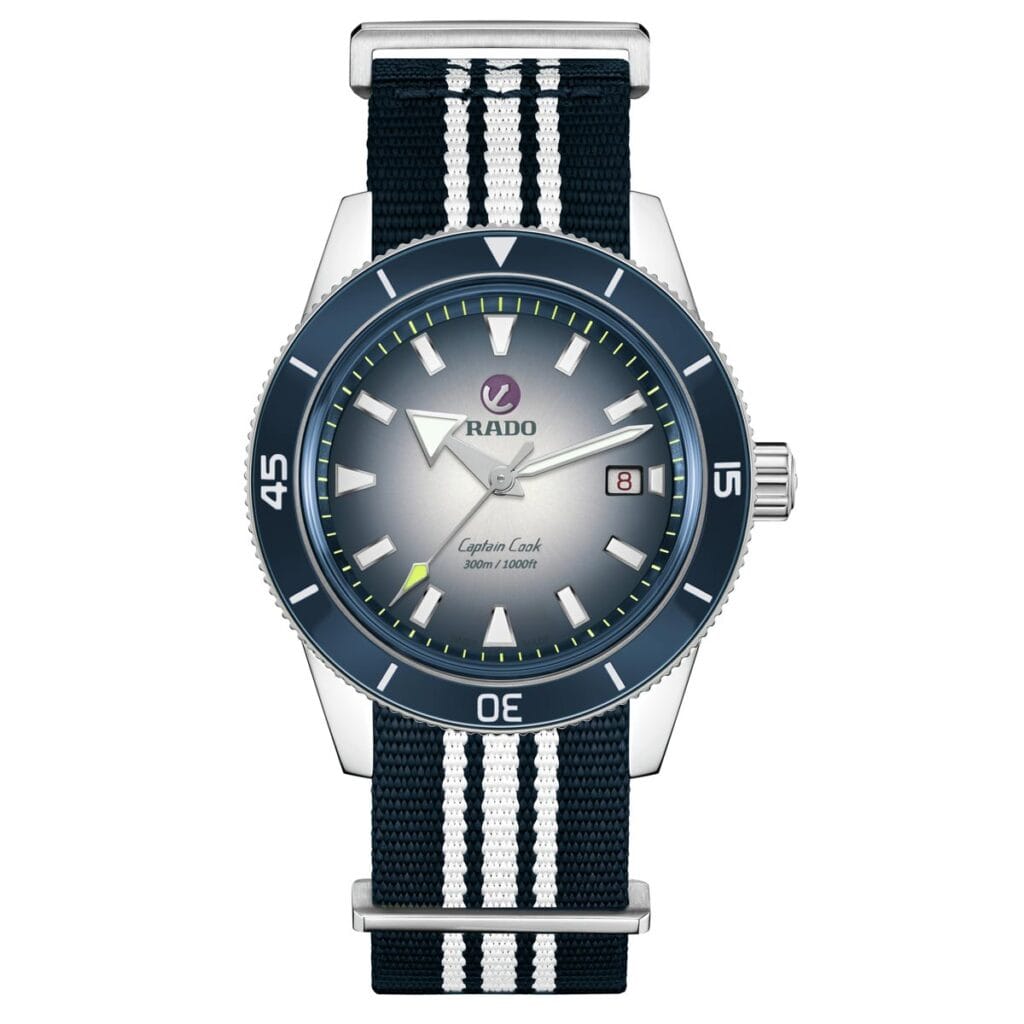 Het nieuwste lid van de Rado Captain Cook-familie heeft naast de kenmerkende keramische bezelinzet en koepelvormige saffierglas een wijzerplaat met een blauw-wit verloop. Het sportieve horloge wordt geleverd met de keuze uit drie verschillende banden.