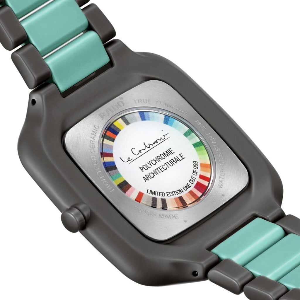 De horloges zijn uitgebracht in drie kleurcombinaties: Slightly Greyed English Green, Grey Brown Natural Umber en Ivory Black met een zwarte wijzerplaat. De kasten van alle modellen zijn 37 x 43,3 millimeter, en hebben een slanke hoogte van slechts 5 millimeter. De achterkant van de quarz horloges met Rado Kaliber R420, zijn zeer de moeite waard om regelmatig bekeken te worden. Ze zijn voorzien van kleurstrepen in de beroemde kleuren van Le Corbusier, digitaal gedrukt op het saffierglas. Op het saffierglas staat ook te lezen: ‘Le Corbusier, polychromie architecturale’ en ‘Limited edition one of 999’.