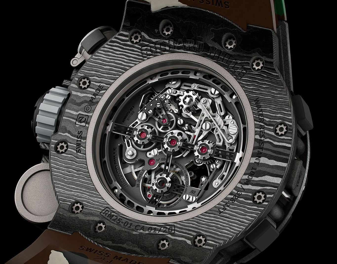 Measuring 50.85 millimeters in diameter and being 23.65 millimeters thick you need indeed quite the wrist to be able to wear this Richard Mille in good fashion. However, thanks to the extensive use of Carbon TPT and titanium its weight remains manageable. These materials also give the watch its unique appearance, while a strap in a camo pattern increases the ‘Rambo-vibe’ of this watch.