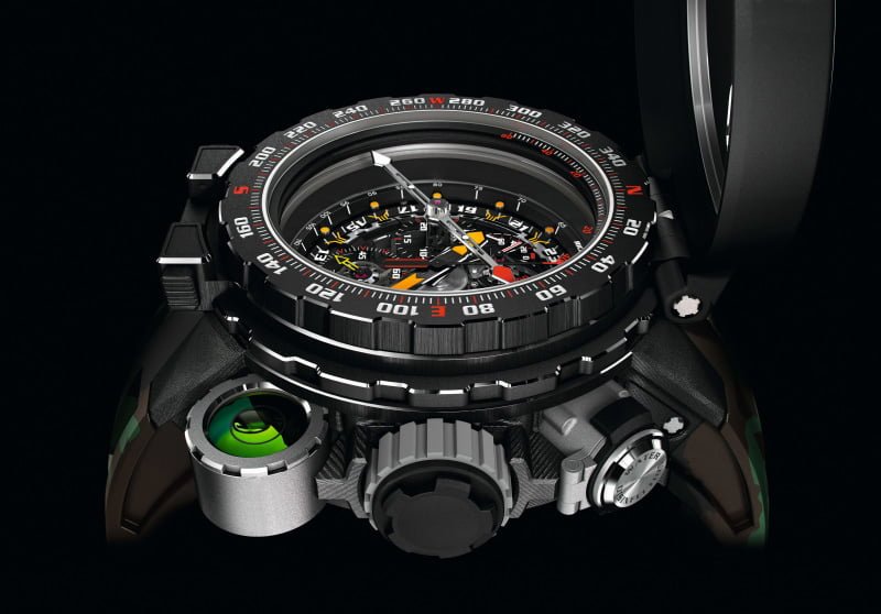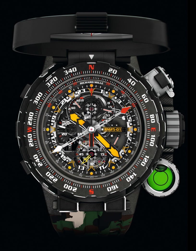 The RM 25-01 Adventure Tourbillon Chronograph comes with a few surprising complications, other than those already included in its name. It is fitted with a compass and even has a spirit level so that you can keep the compass level for increased accuracy. A special compartment at the side of the case contains five capsules that each can make one liter of water safe to drink. Now there is a complication you don’t often see in a wristwatch!